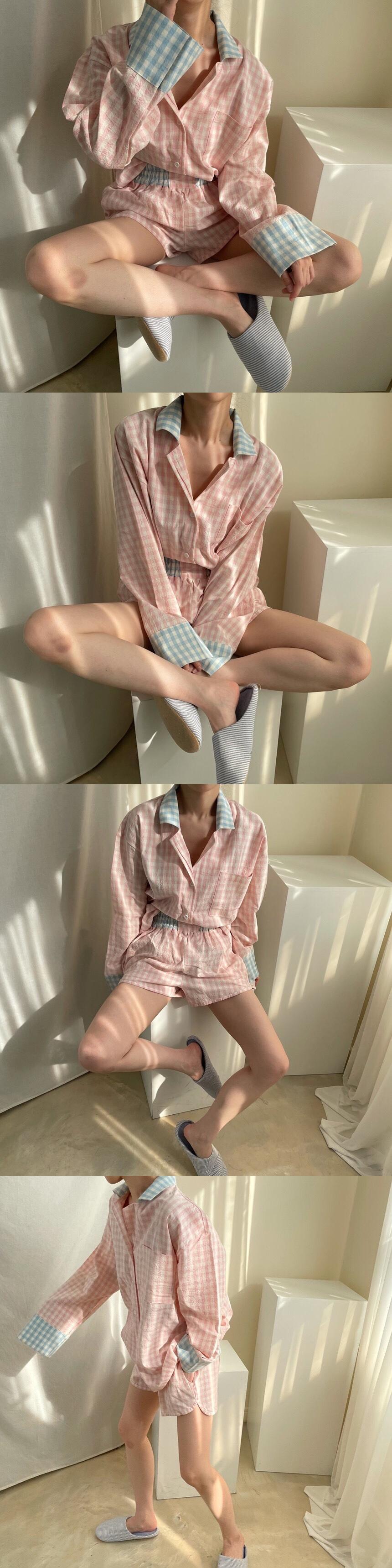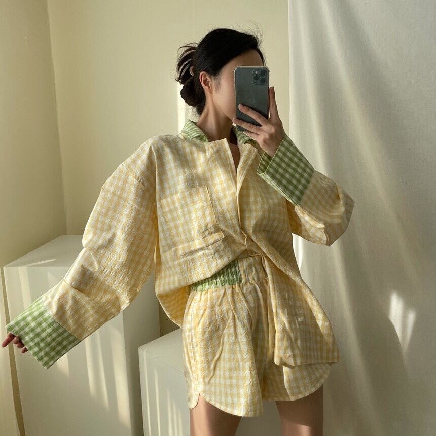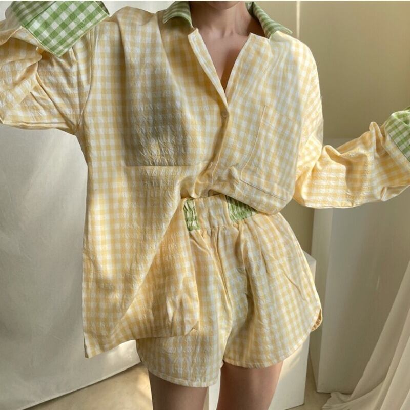 サマーカラー格子柄シャツ カジュアルショーツ セット 大人ガーリー スウィート キュート 夏物 ブルマー 韓国婦人40370717473