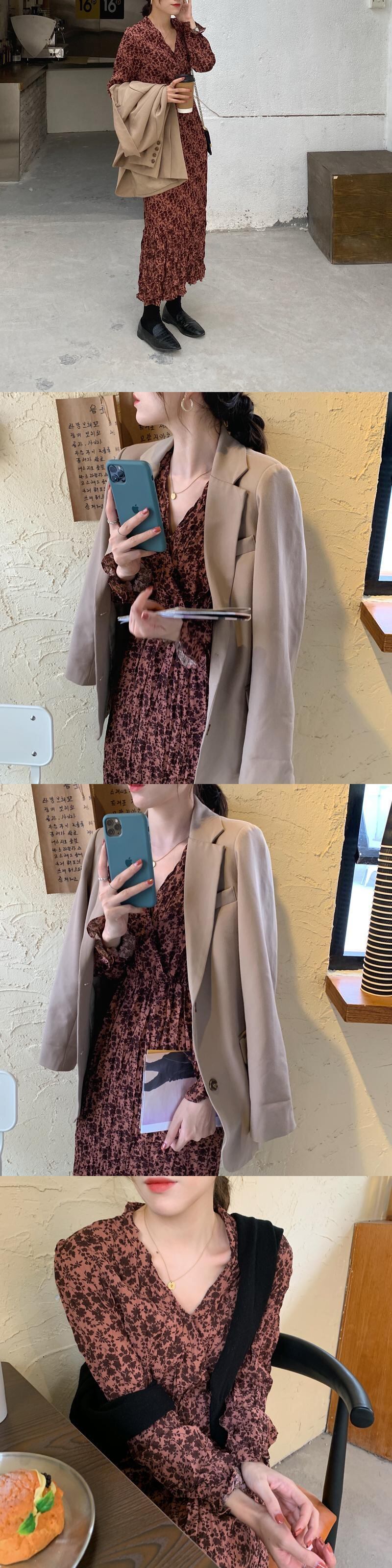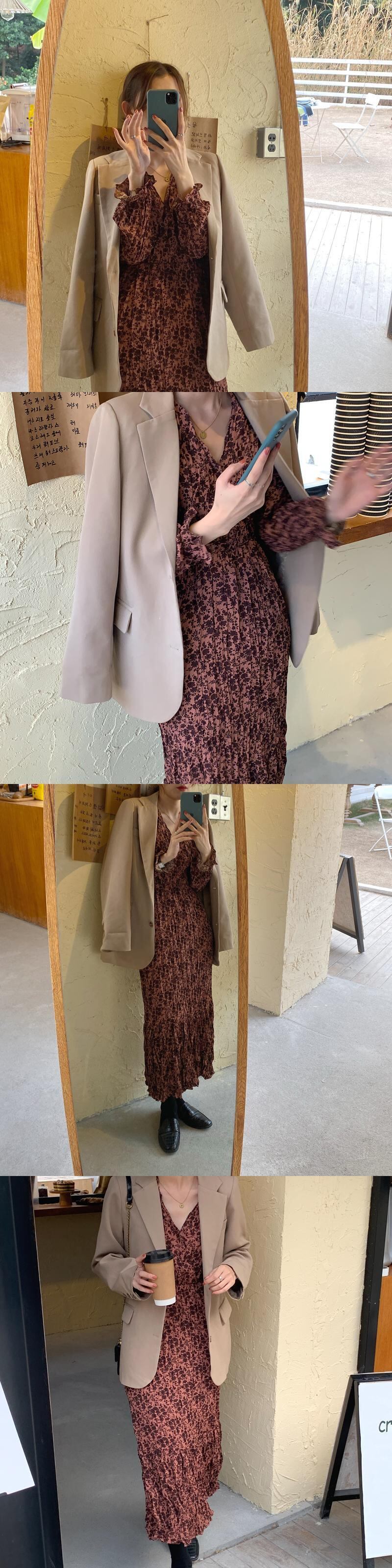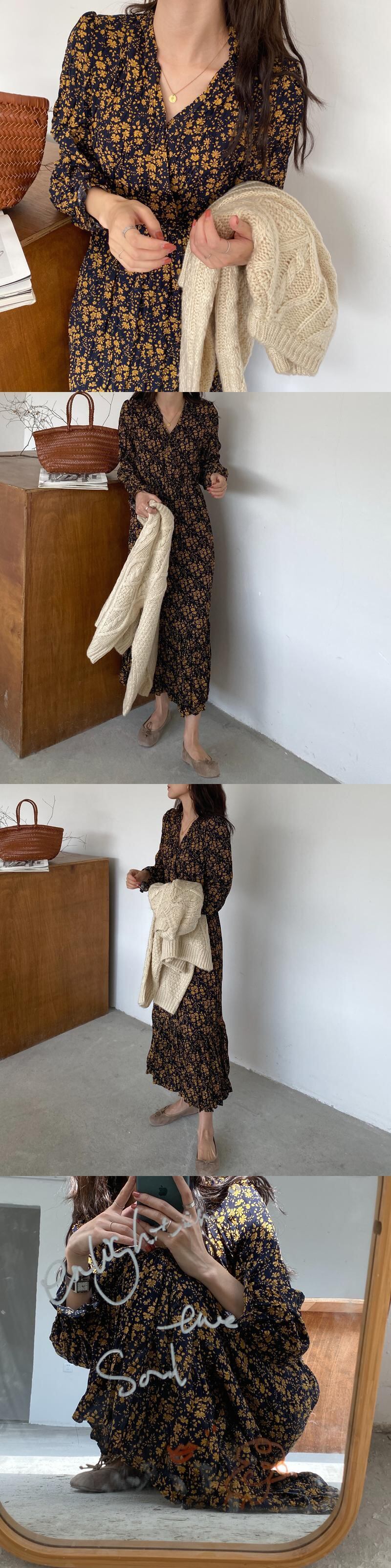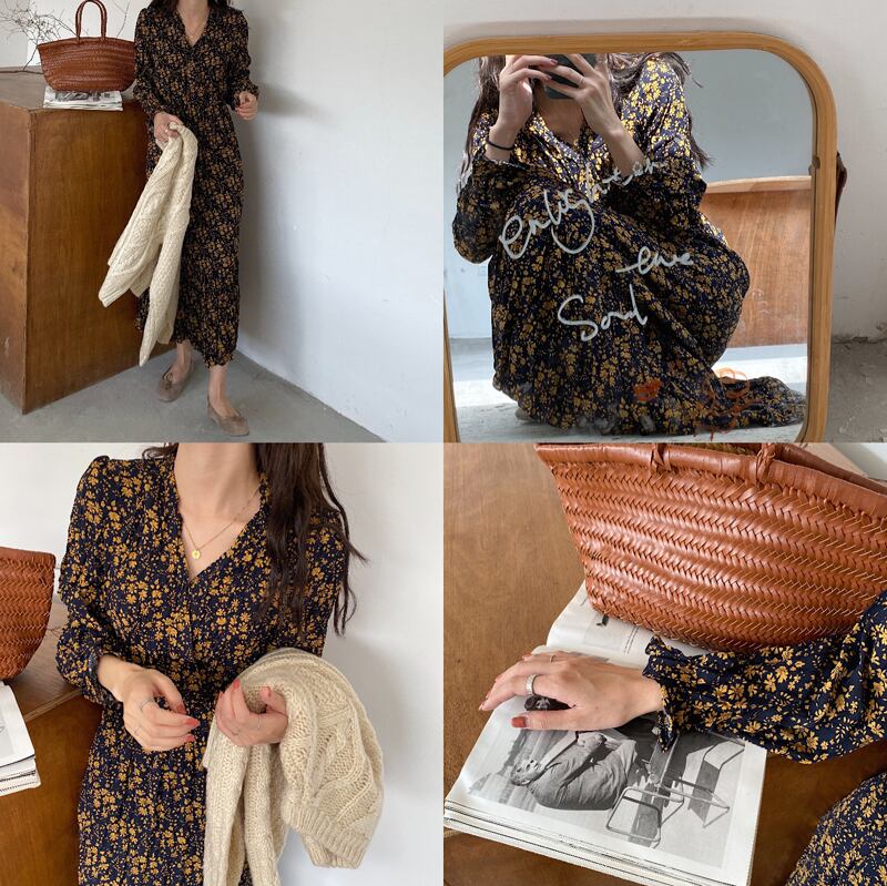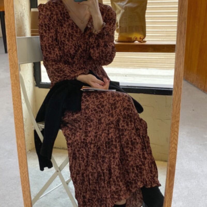Vネックフローラルウェストプリーツスリーブドレス ロングスカート レッド 花柄 韓国婦人55070307309