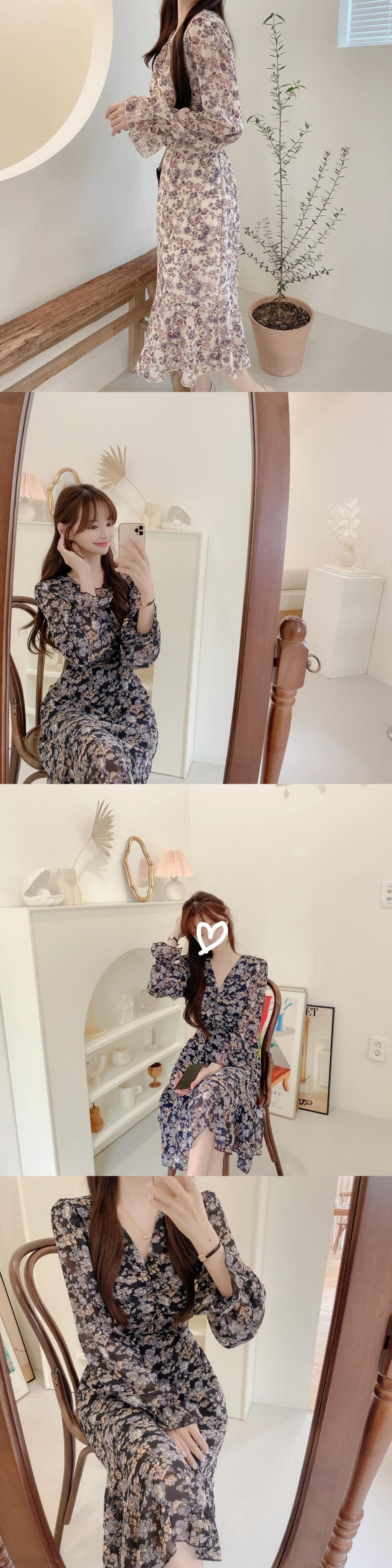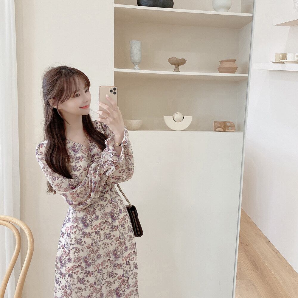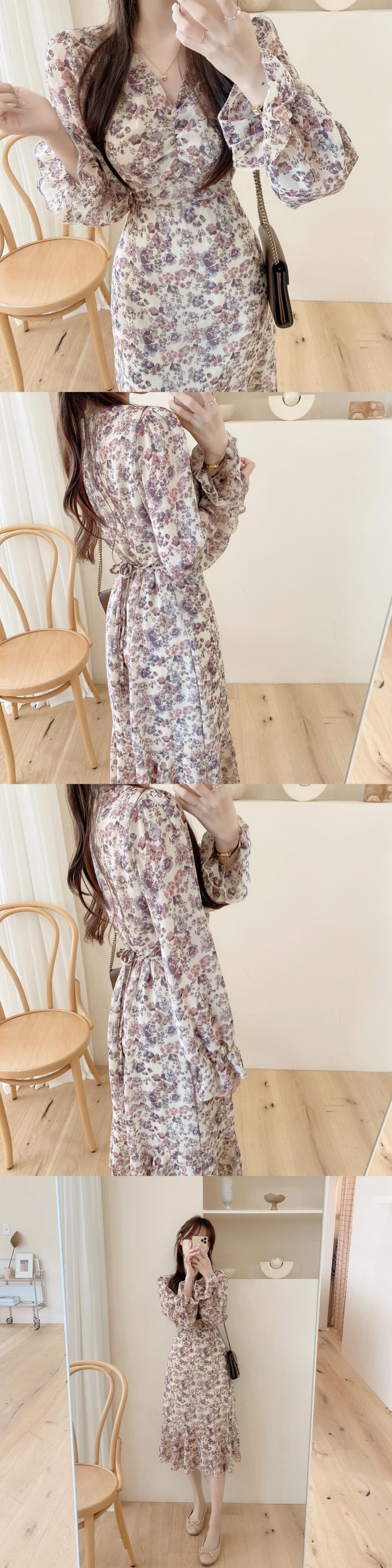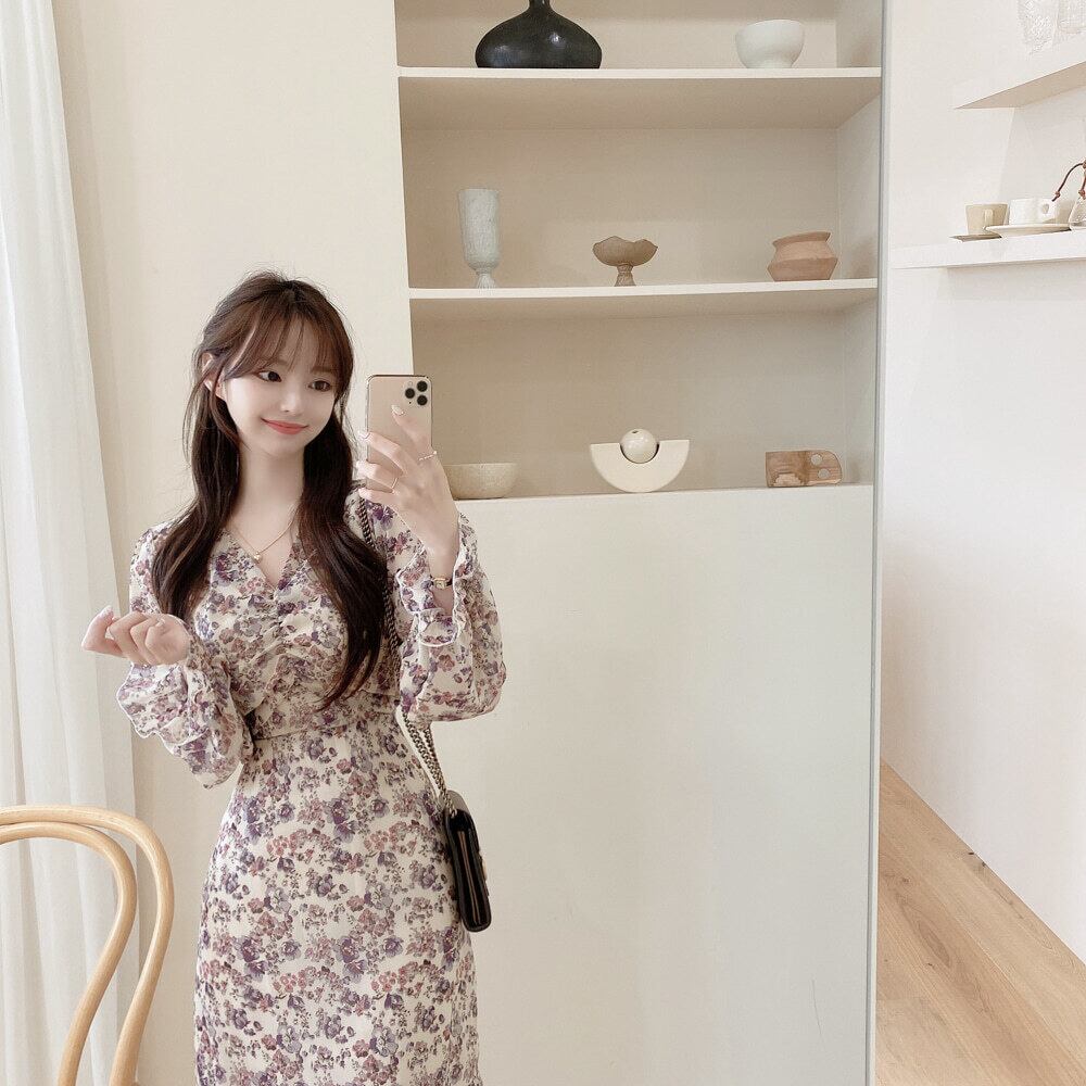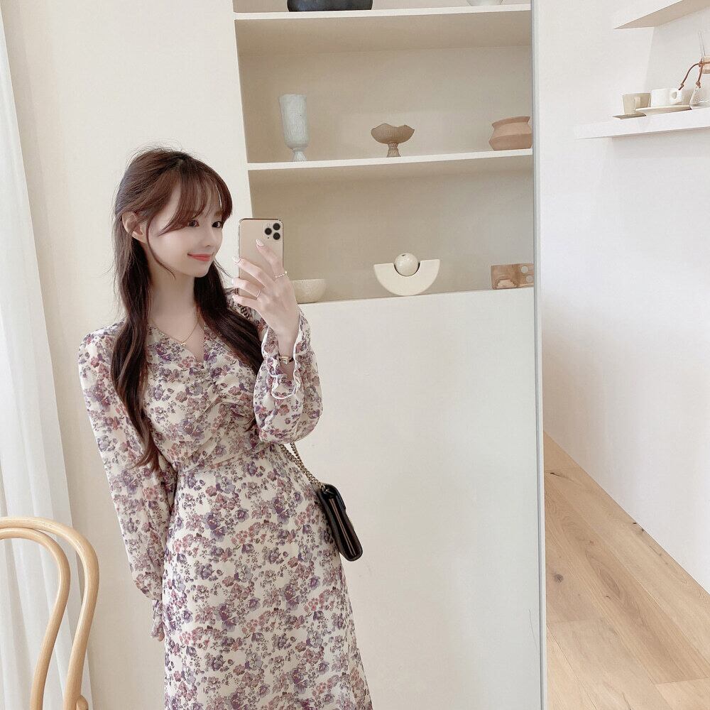 スプリングスタイルフローラルウェストVネックスリムシフォンドレス 春物 花柄 韓国婦人27263943734
