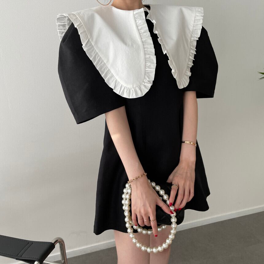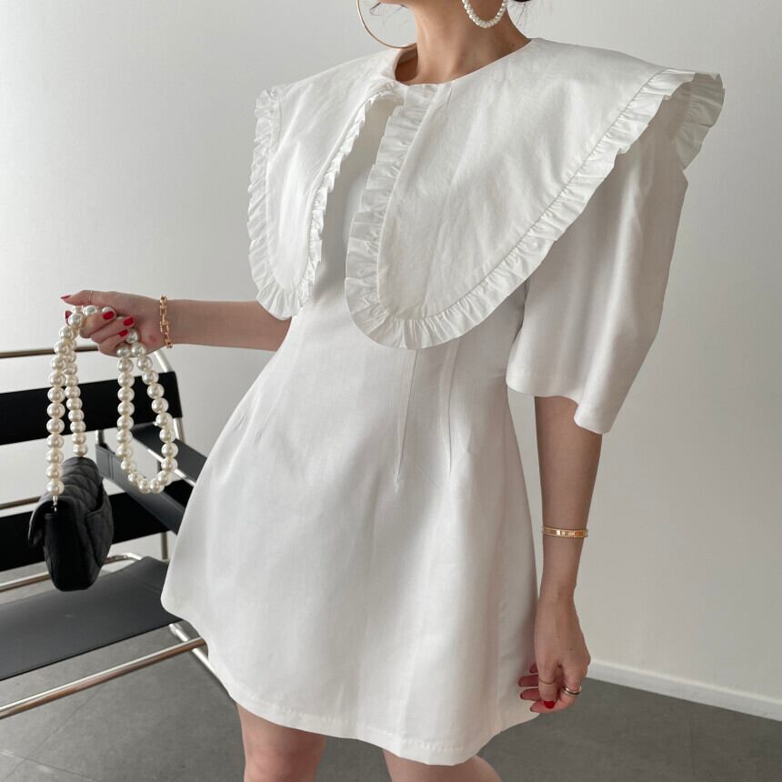 スタンダードカラーウェストスリーブドレス サマーショートスカート レトロ 夏物 韓国婦人37756128028