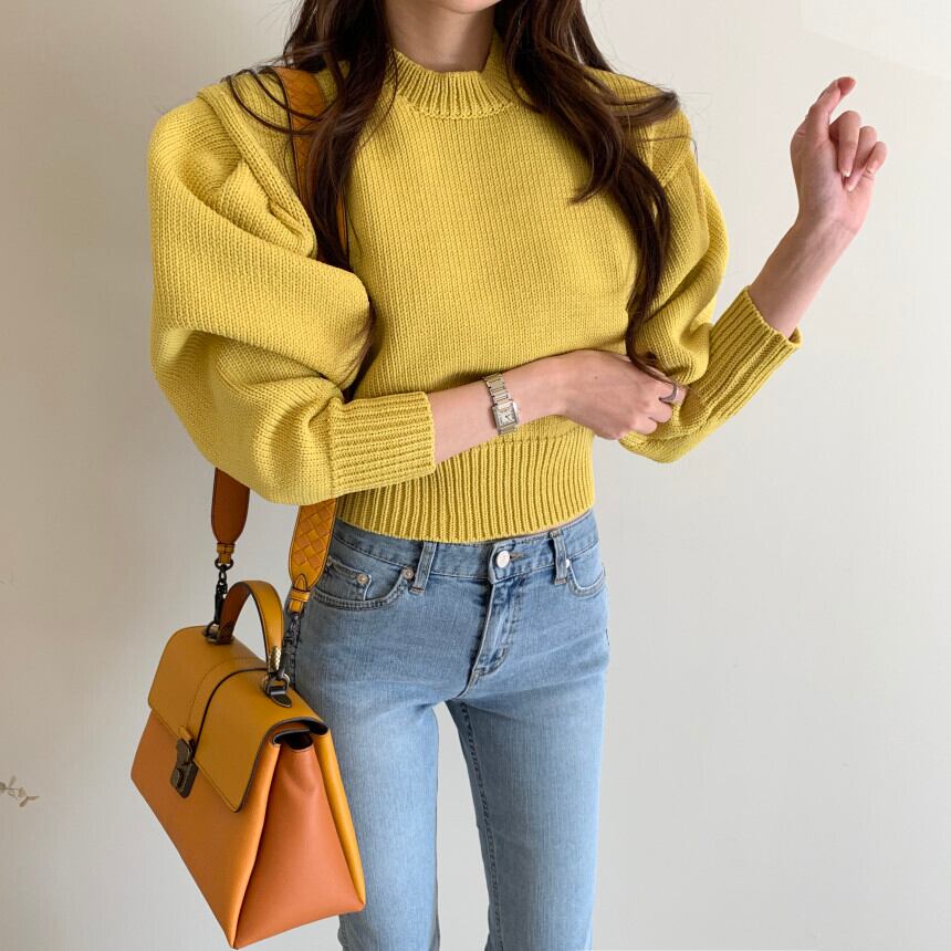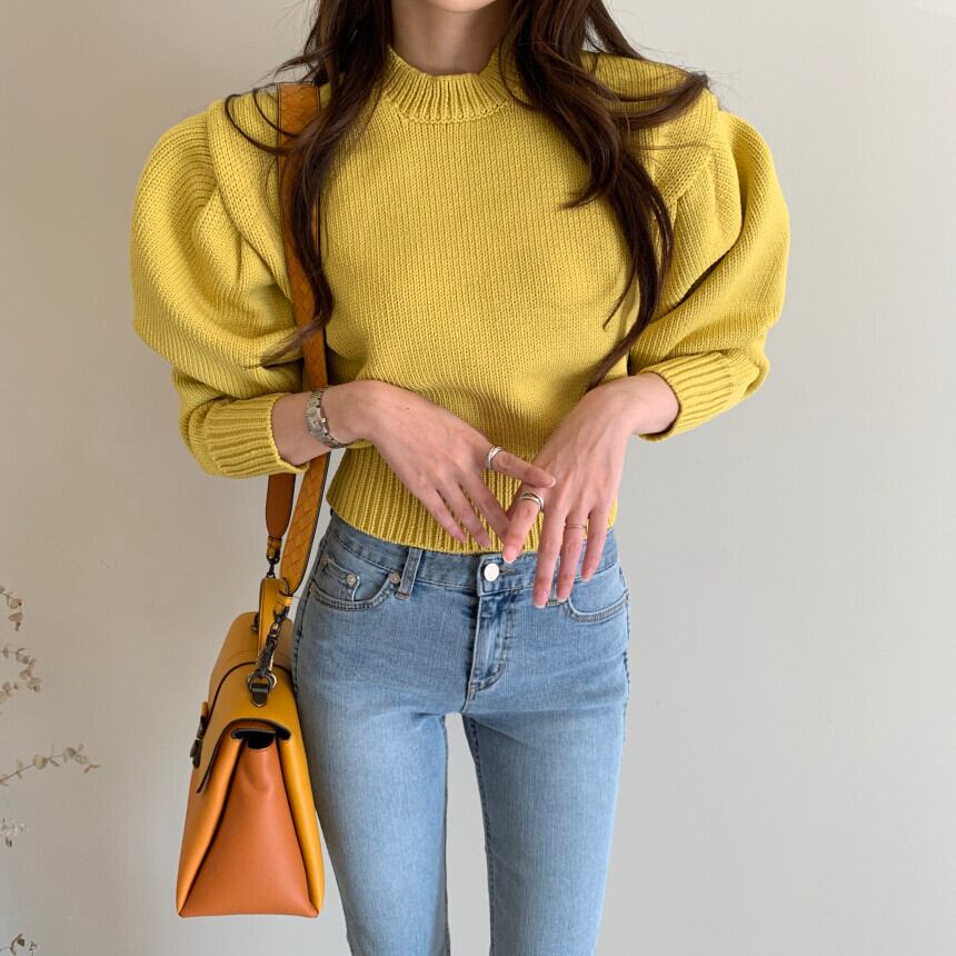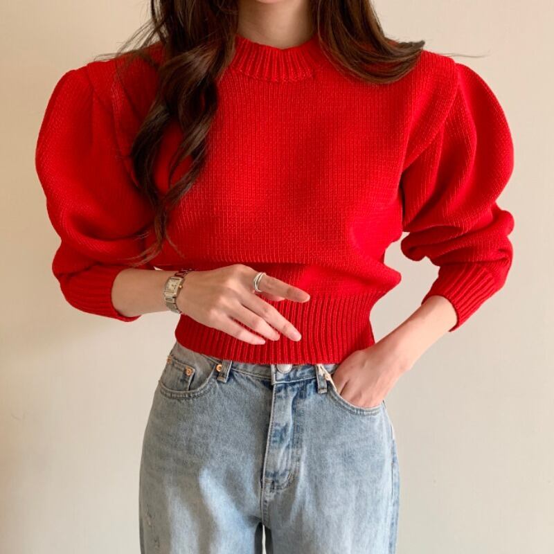 スプリングスタイルラウンドネックスリーブショートウェストソリッド カラーセーター トップス レディース 春物 Oネック ソリッドカラー 韓国婦人21348537713