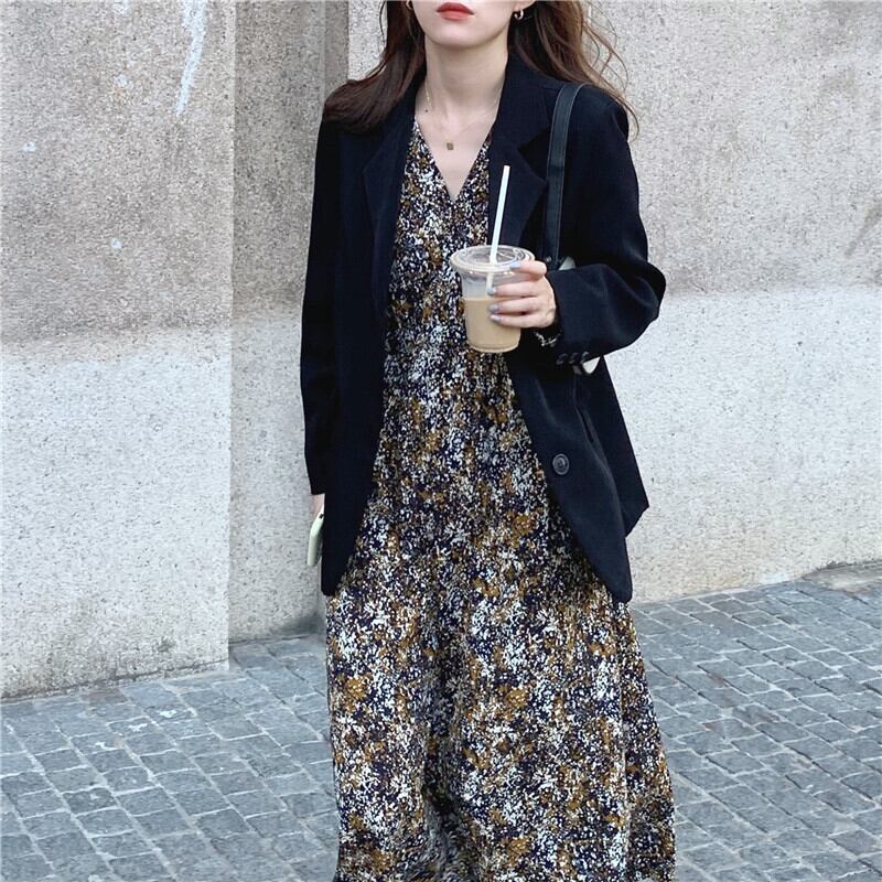 スカート スプリングVネックドレス ウェストスタンダードフローラルロング レトロ 春物 花柄 韓国婦人53043342156