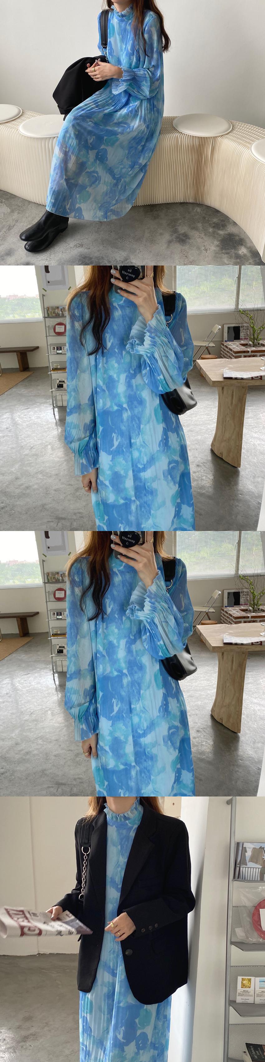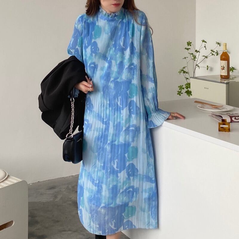 スタイルカラールーズホワイトプリント柄プリーツシフォンドレス 韓国婦人1095727566