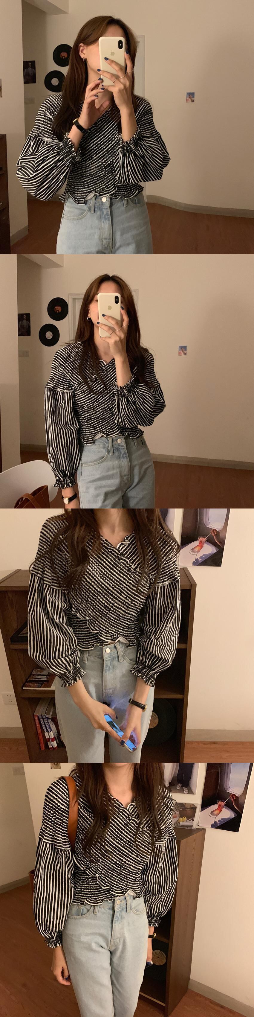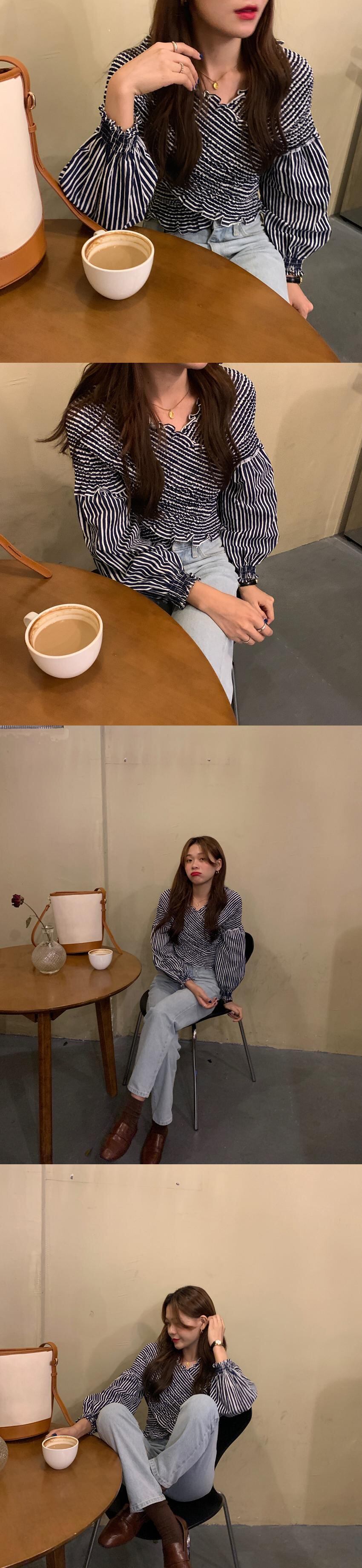 オータムVネックスリーブトップス スリムストライプシャツ レディース ロング 大人ガーリー スウィート キュート カジュアル 秋物 韓国婦人67261639777