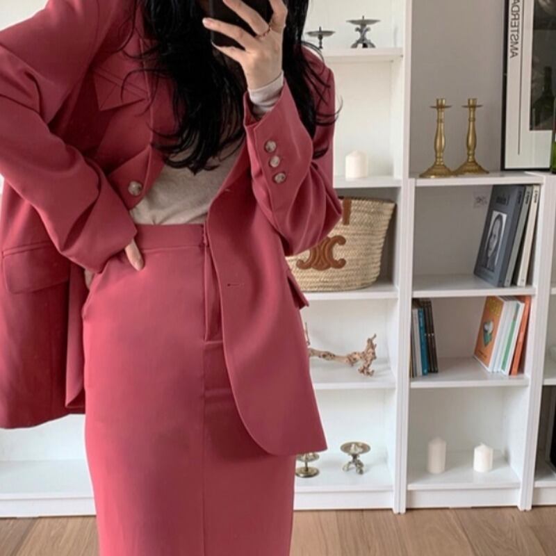 スプリングジャケット ハイウェストウェストスカート レッド 春物 韓国婦人5971592712