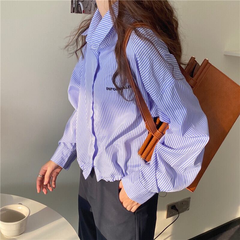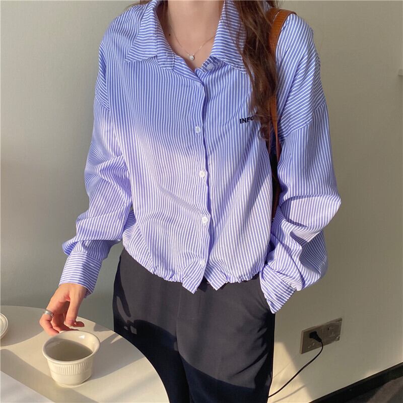 スプリングショートストライプギャザーシャツ ロング レッド 刺繍 春物 韓国婦人50144483393