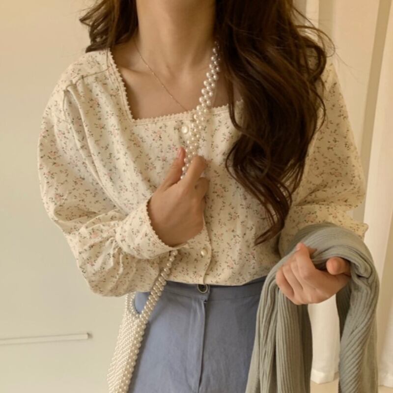スプリングスタイルレディースブラウス フローラルシャツ ロング 大人ガーリー スウィート キュート カジュアル 春物 花柄 スクウェア 韓国婦人24127239570