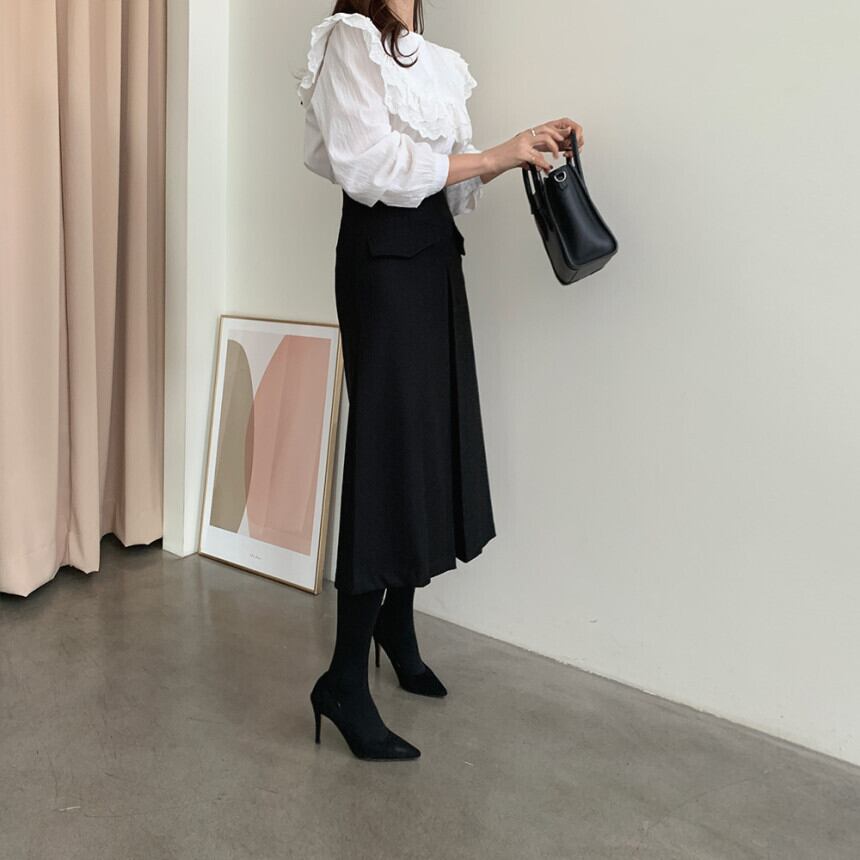 スプリングレースシャツ ハイウェストウェストブラックスカート 春物 ステッチ 韓国婦人71272861951