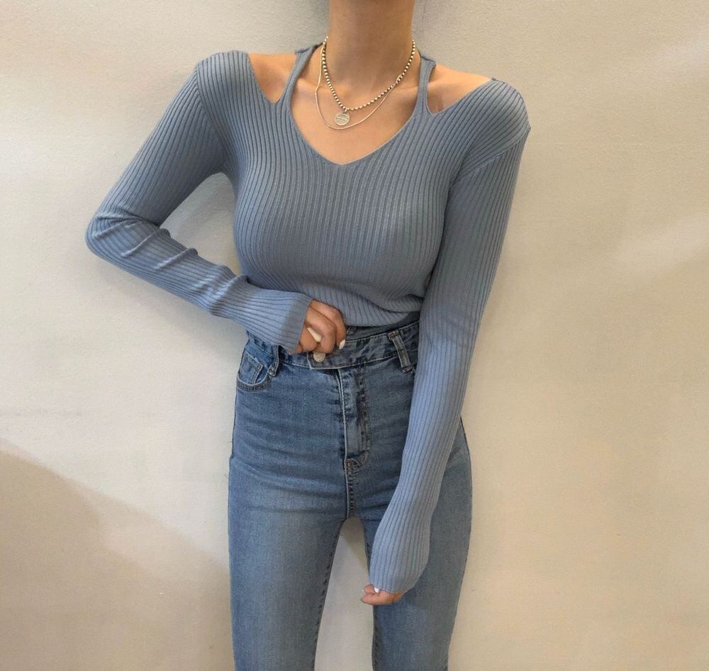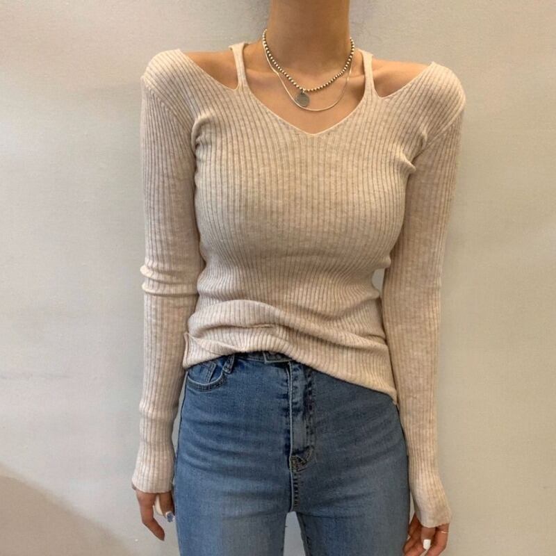 スプリングオータムスタイルVネックスリムホルターストラップレスセーター レディース ロング 春物 秋物 韓国婦人96160108567