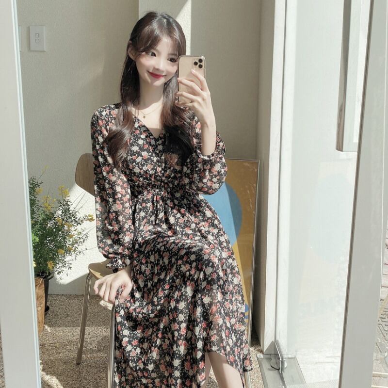 スプリングプリントVネックシフォンドレス スタンダードウェストスリムスカート レトロ 春物 韓国婦人92163916261