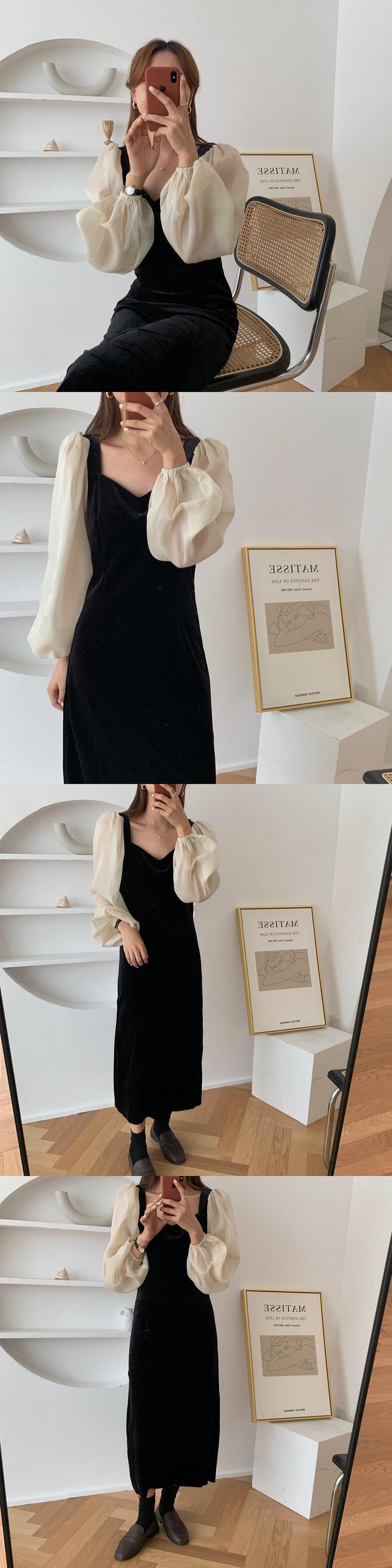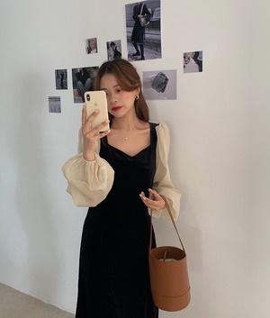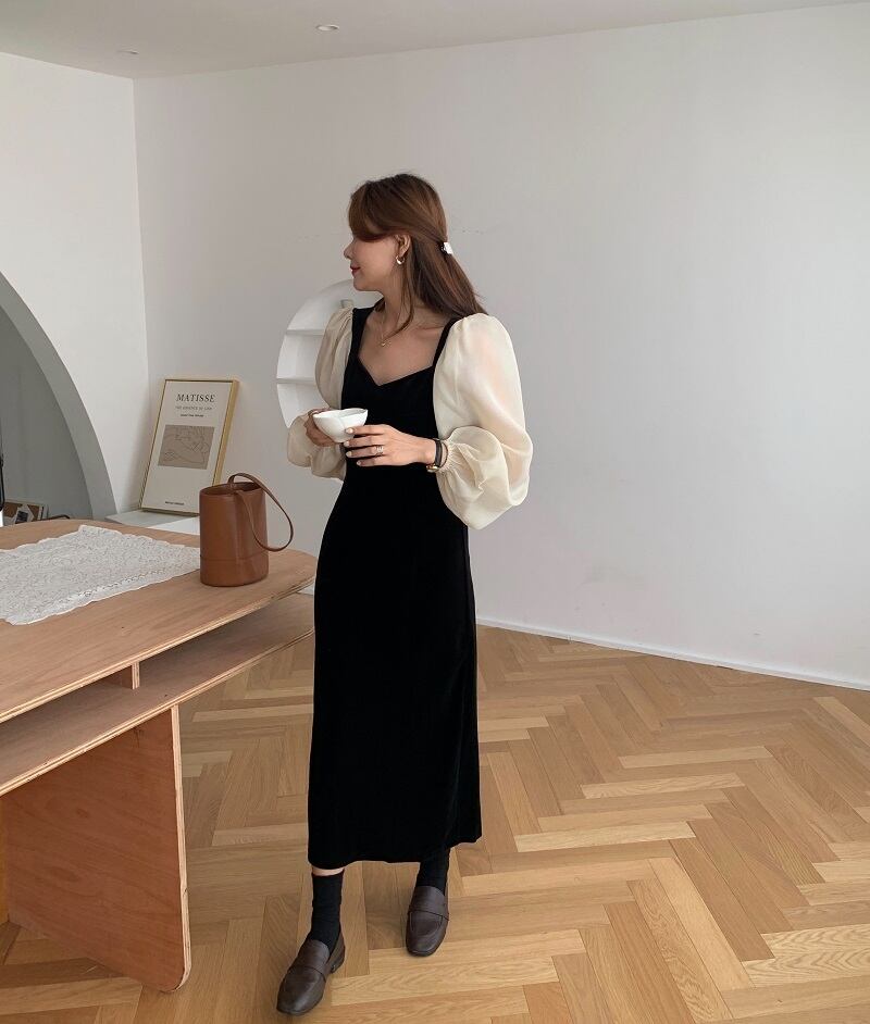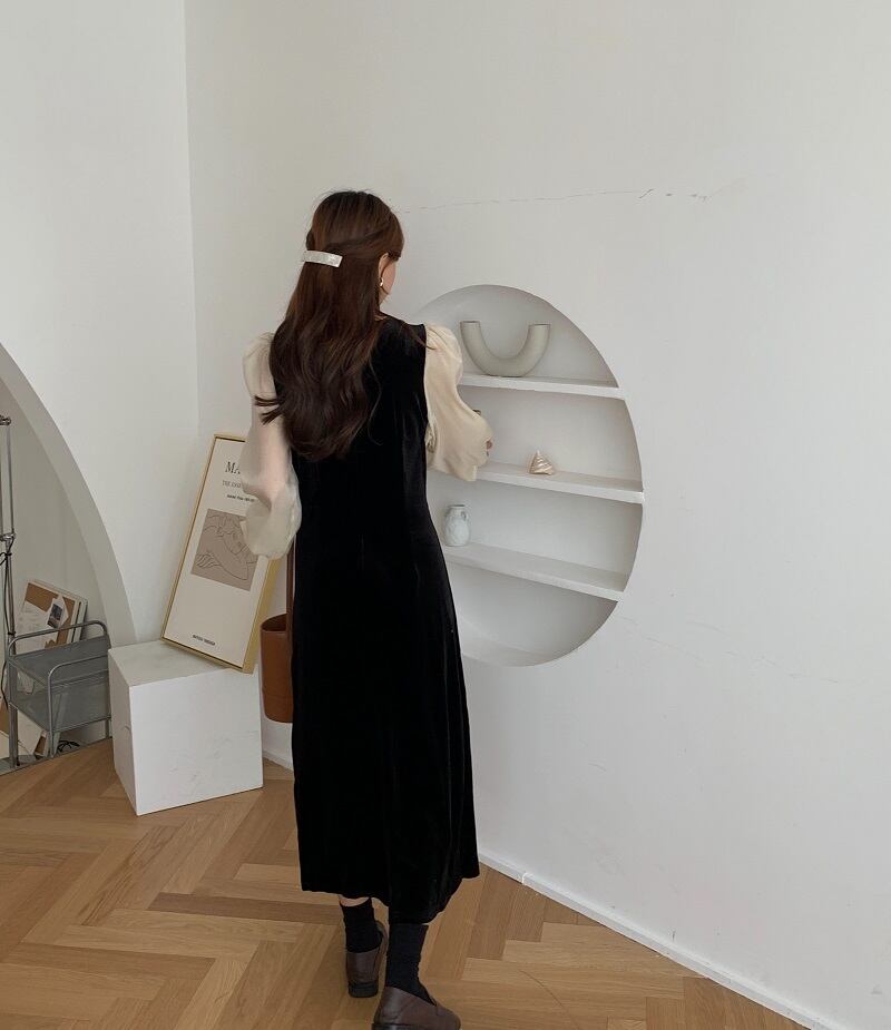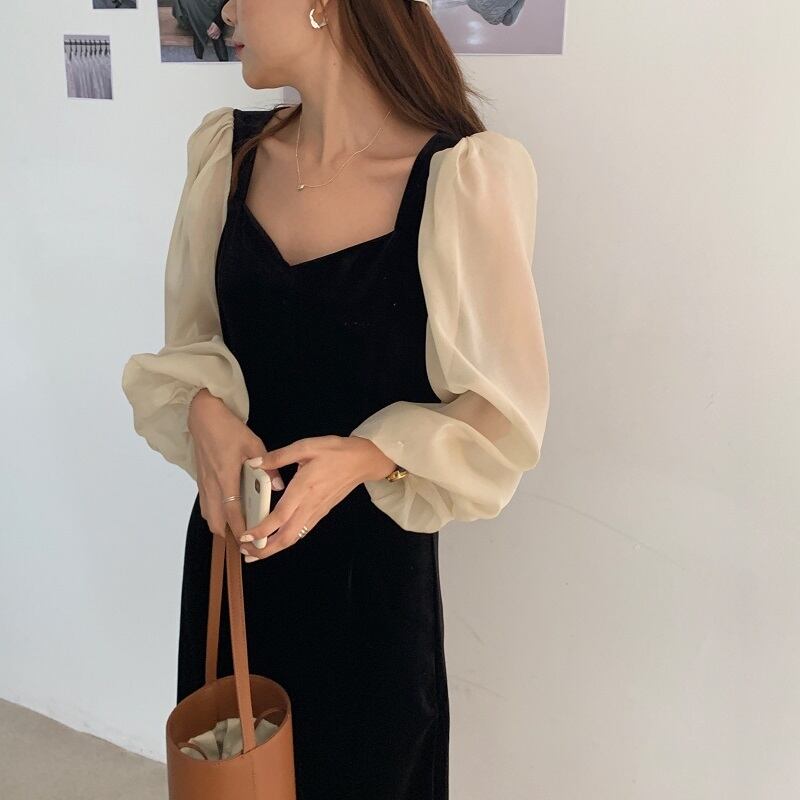 スプリングスリムドレス カラーベルベットロングスカート 春物 ステッチ 韓国婦人41475418743