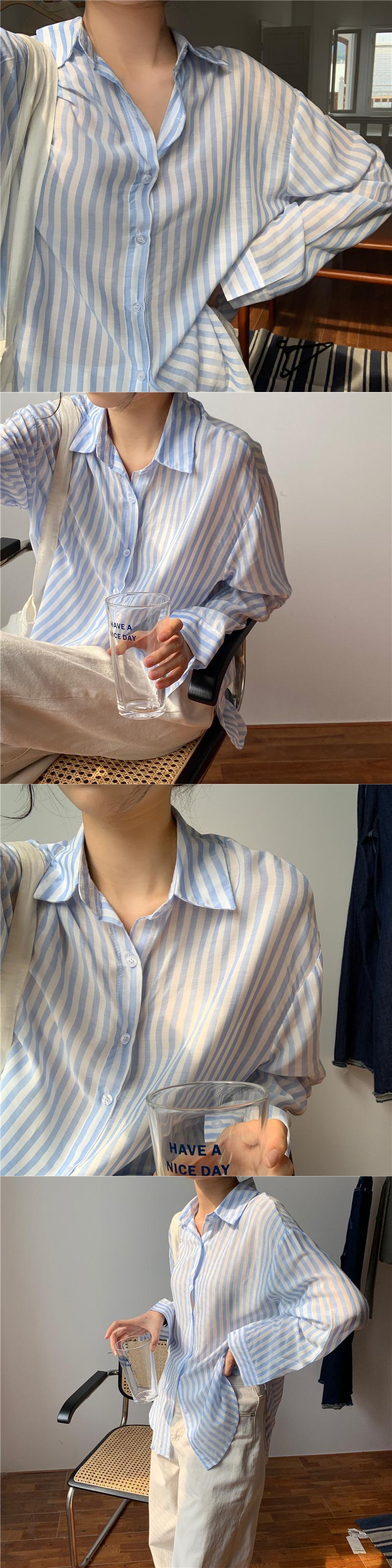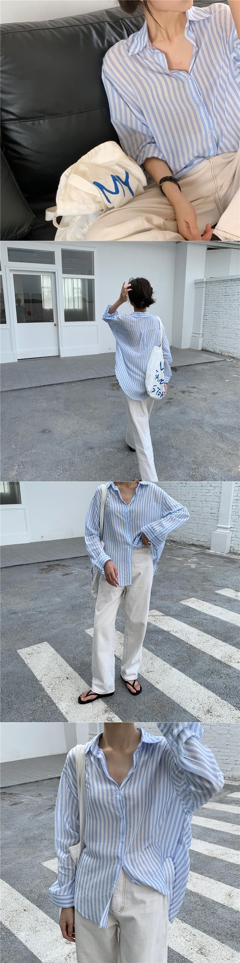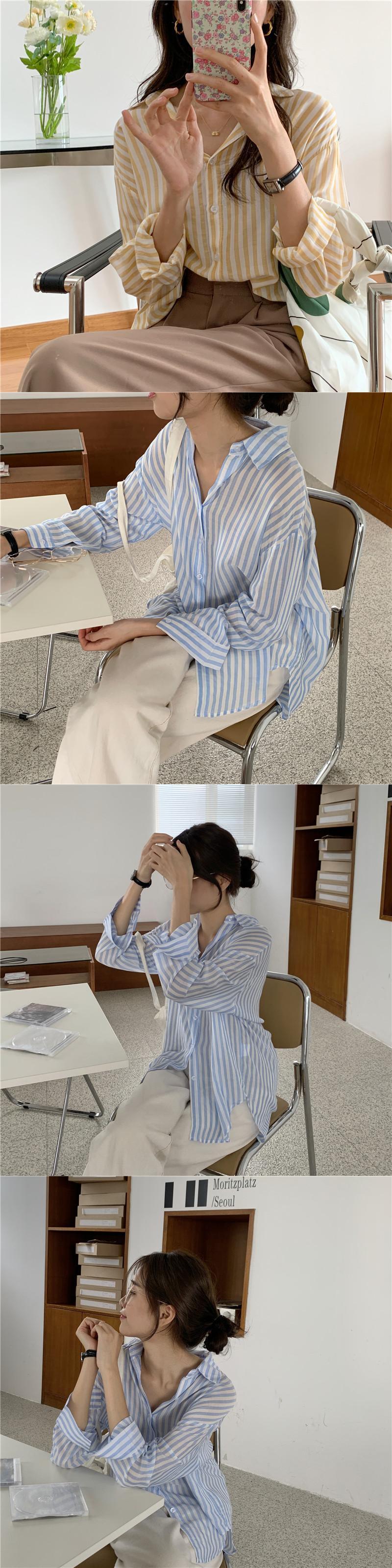 スプリングブラウス ストライプルーズ薄手シャツ ロング 春物 韓国婦人32129241255