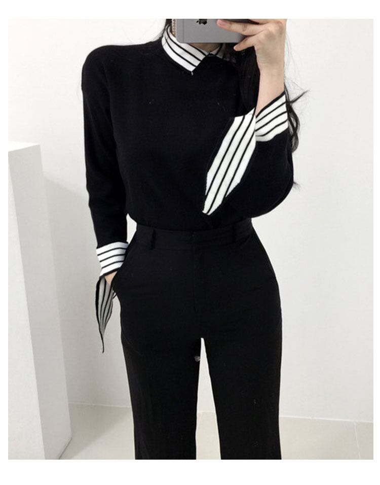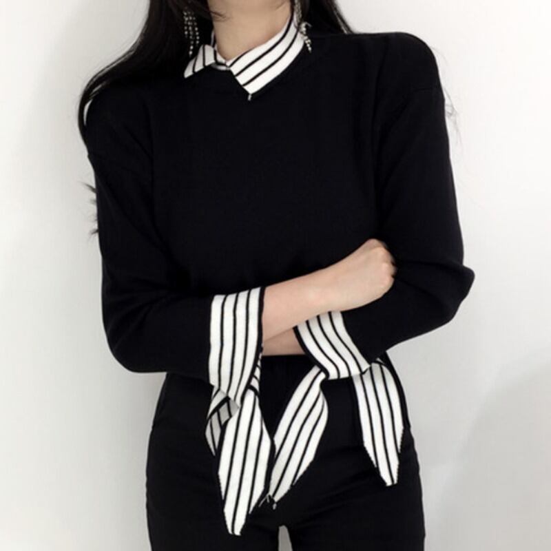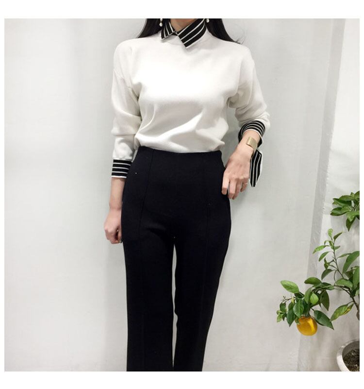 オータムスタイルレースカラーストライプニットトップス スリム長袖スリーブセーター シャツ ロング 秋物 韓国婦人40322869619