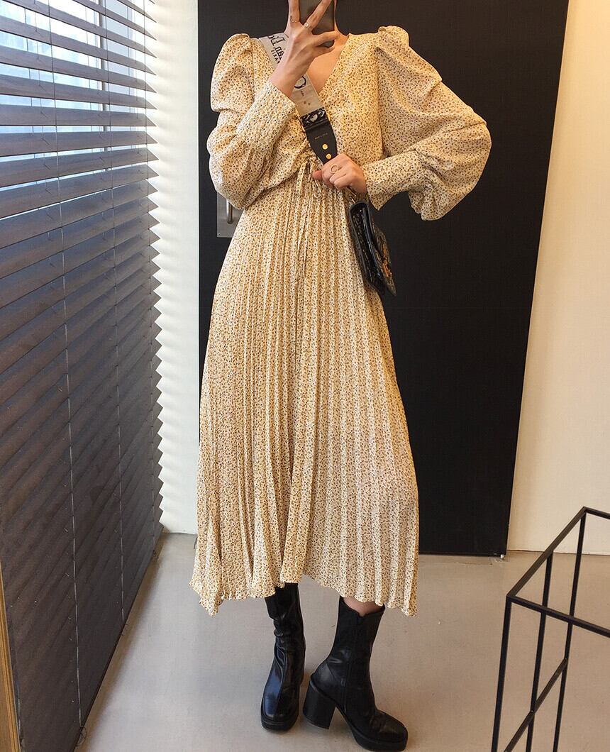 スプリングドレス プリーツVネックフローラル薄手 春物 花柄 韓国婦人54073698624