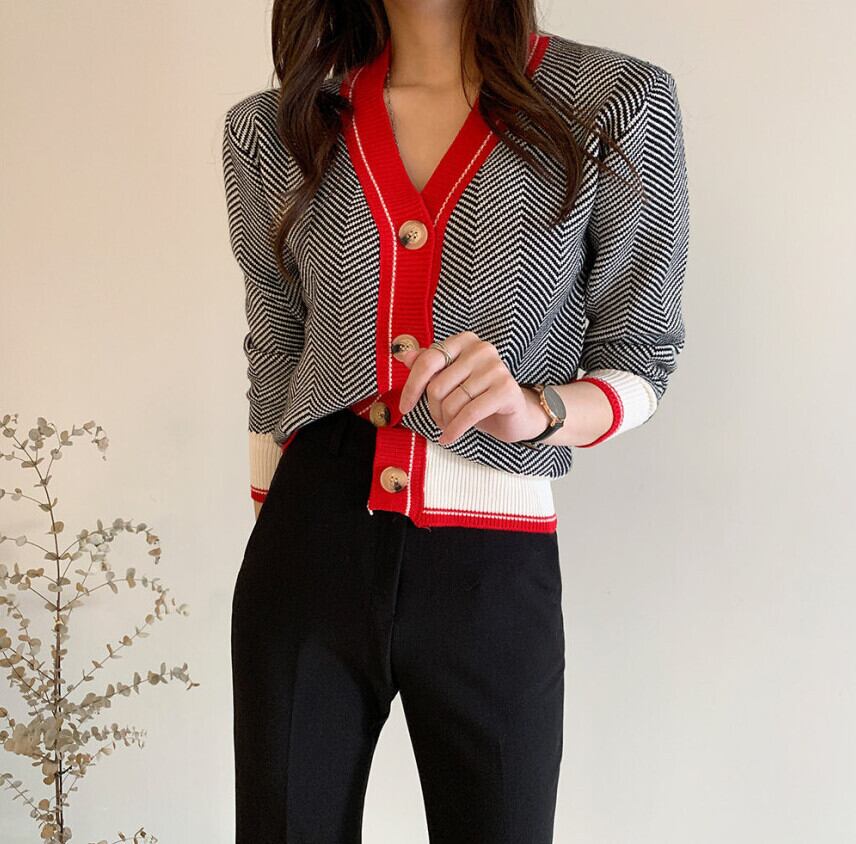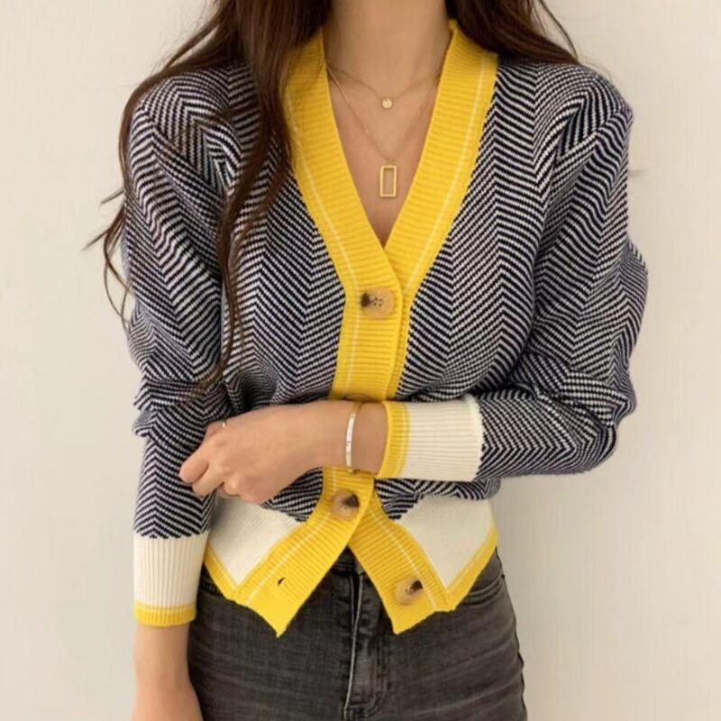 オータムニットトップス スタンダードカラーVネックセーター 薄手コート ロング レトロ 秋物 韓国婦人17191498450