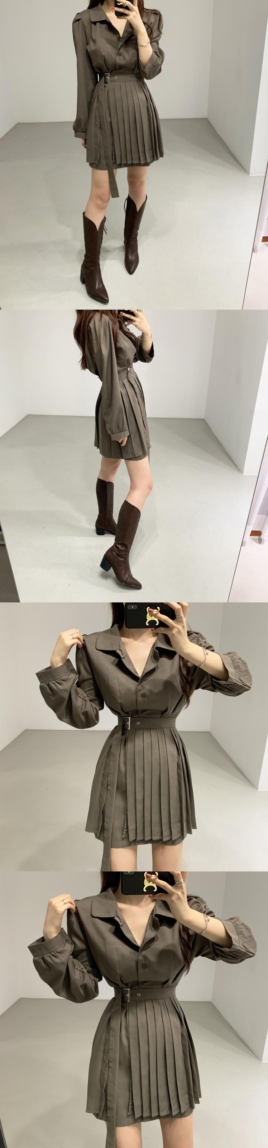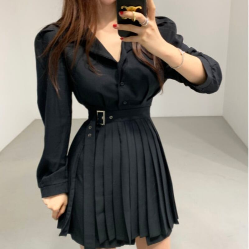 オータムスタイルシャツ ドレス ハイウェストウェストレースプリーツスカート レディース 秋物 韓国婦人85178657290