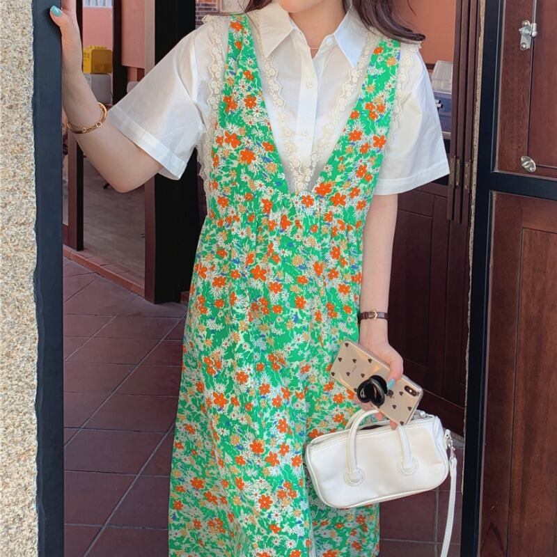 サマーカラーホワイトシャツ レースフローラルドレス 大人ガーリー スウィート キュート カジュアル 夏物 花柄 ステッチ 韓国婦人17229763807