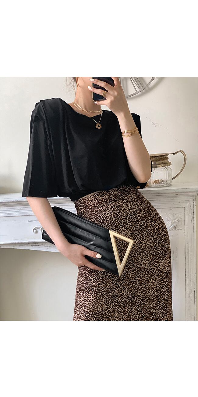 スタンダードスタイルラウンドネックスリーブTシャツ ハイウェストウェストレオパードプリント柄スカート サマー レトロ 夏物 Oネック 韓国婦人61881190754