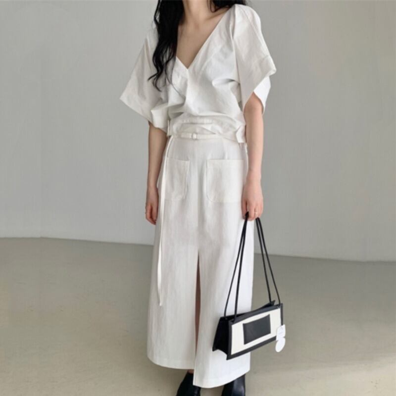 サマーVネックトップス ハイウェストウェストポケットカジュアルパンツ レディース 夏物 韓国婦人46390915863