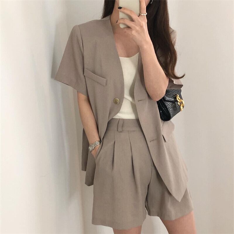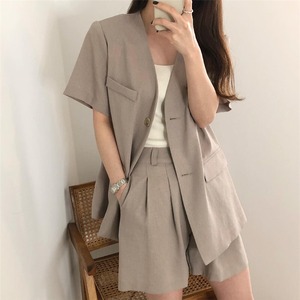 サマースタンダードVネックウェストジャケット プリーツカジュアルショーツ レディース レトロ ストリート 夏物 ブルマー 韓国婦人64972360344