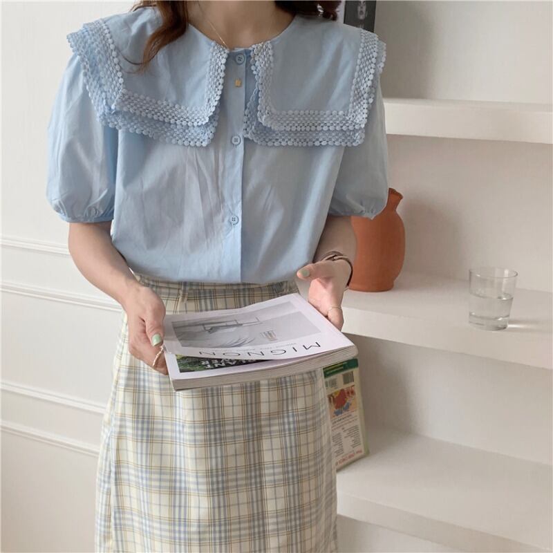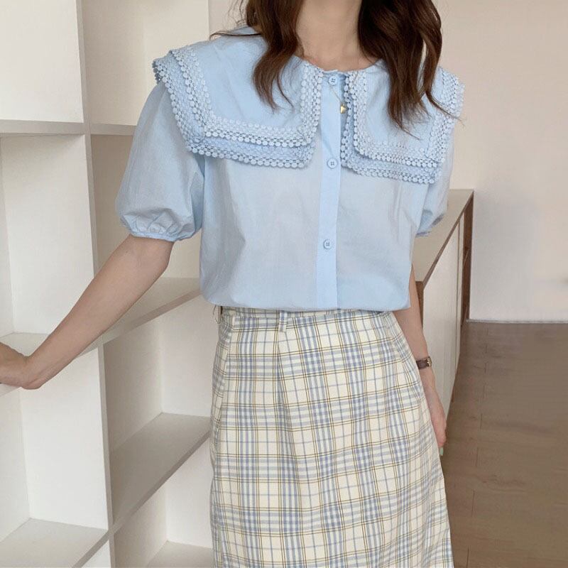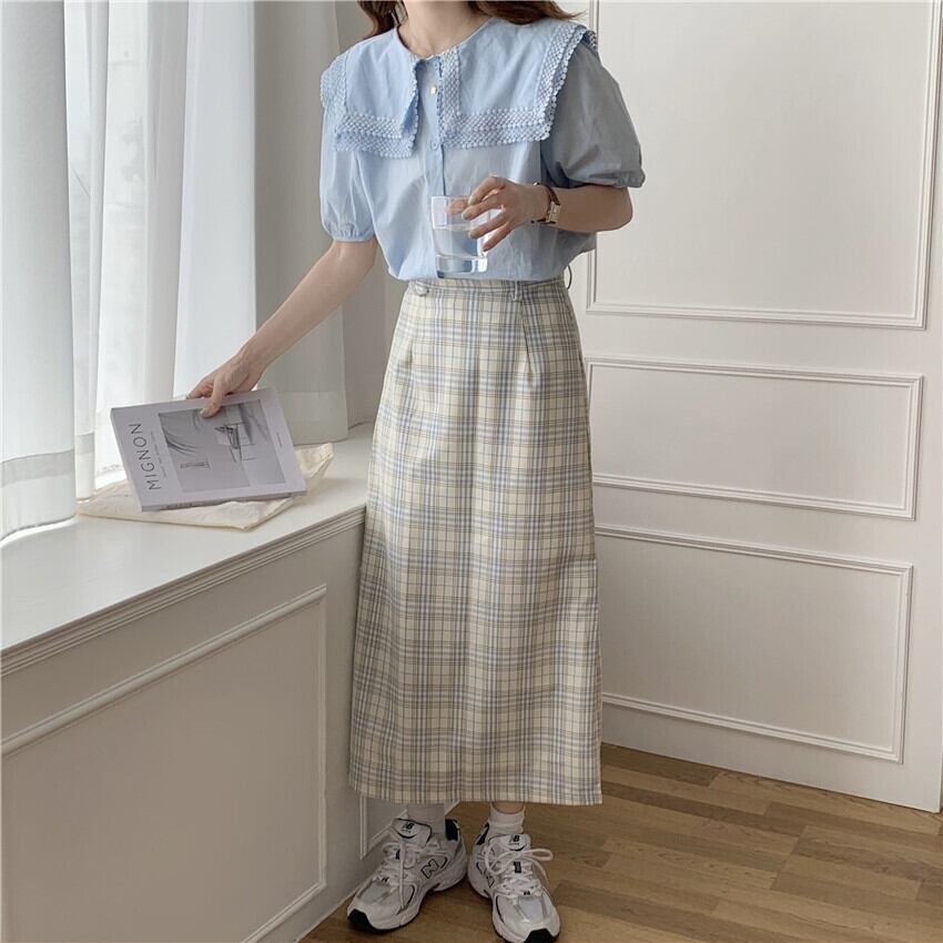レースカラーシャツ 格子柄スカート サマー 夏物 韓国婦人80808802879