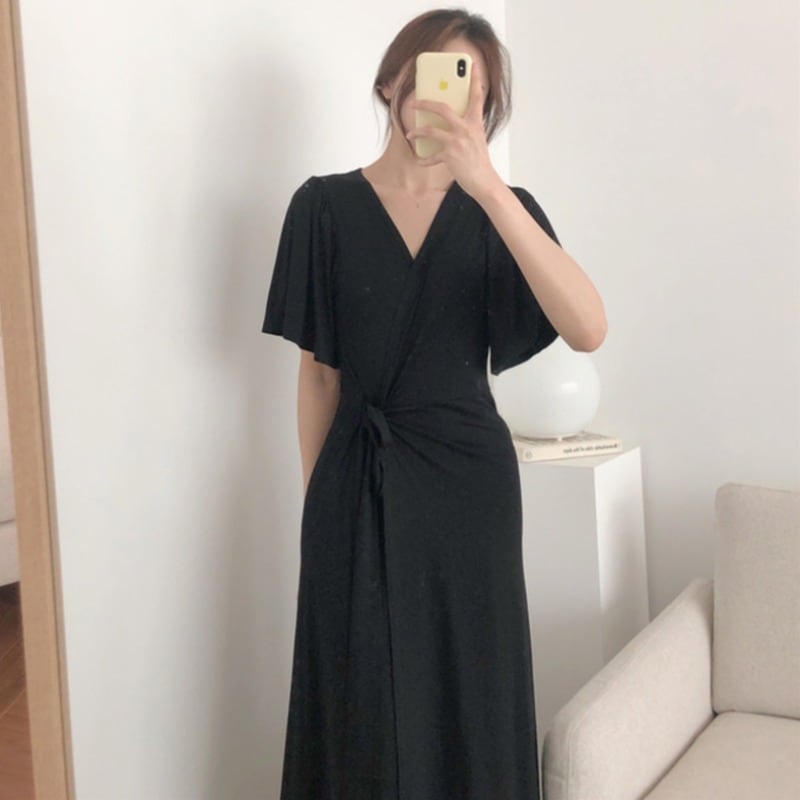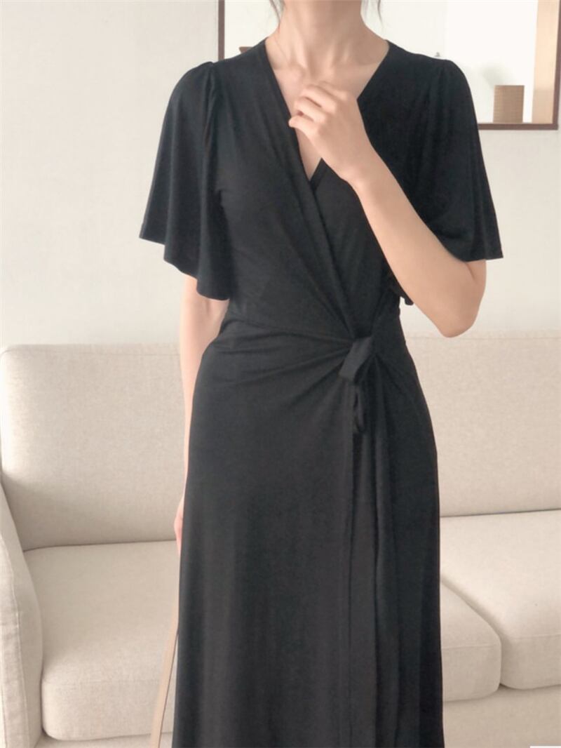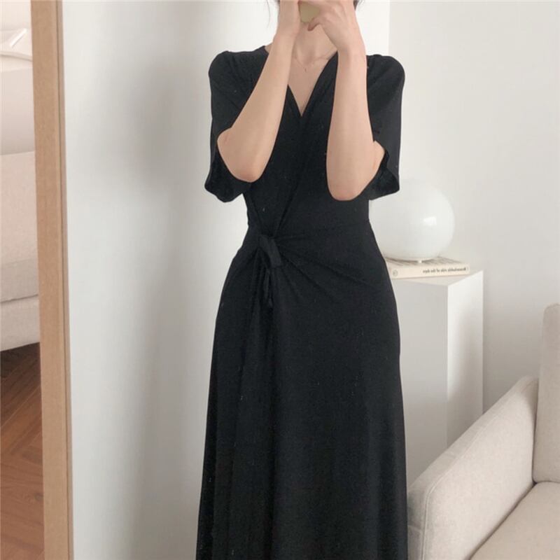 スタンダードブラックウェストVネックドレス ロングスカート サマー レトロ 夏物 韓国婦人19449761587