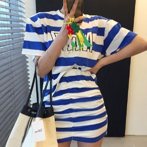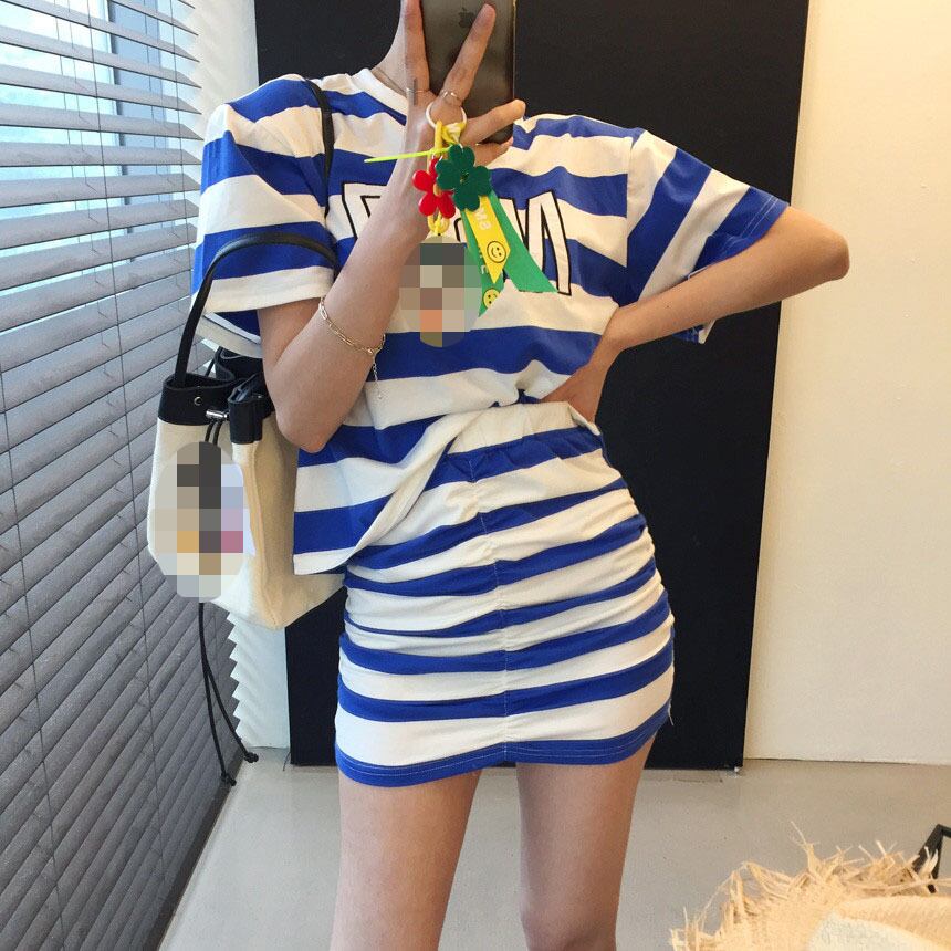 スタンダードプリント柄ルーズストライプTシャツ ハイウェストウェストスカート サマー レトロ ストリート 夏物 韓国婦人15171512033