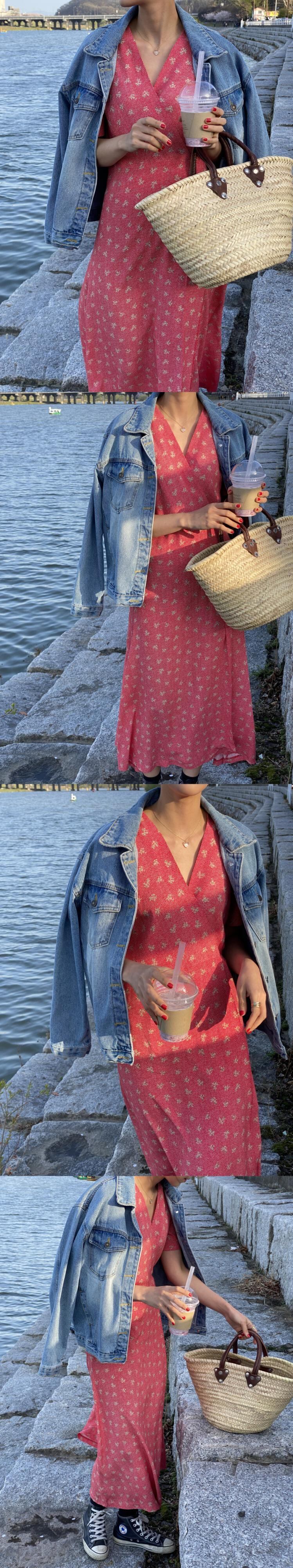 サマーフローラルVネックスリーブドレス スカート 大人ガーリー スウィート キュート カジュアル 夏物 花柄 韓国婦人37618342741
