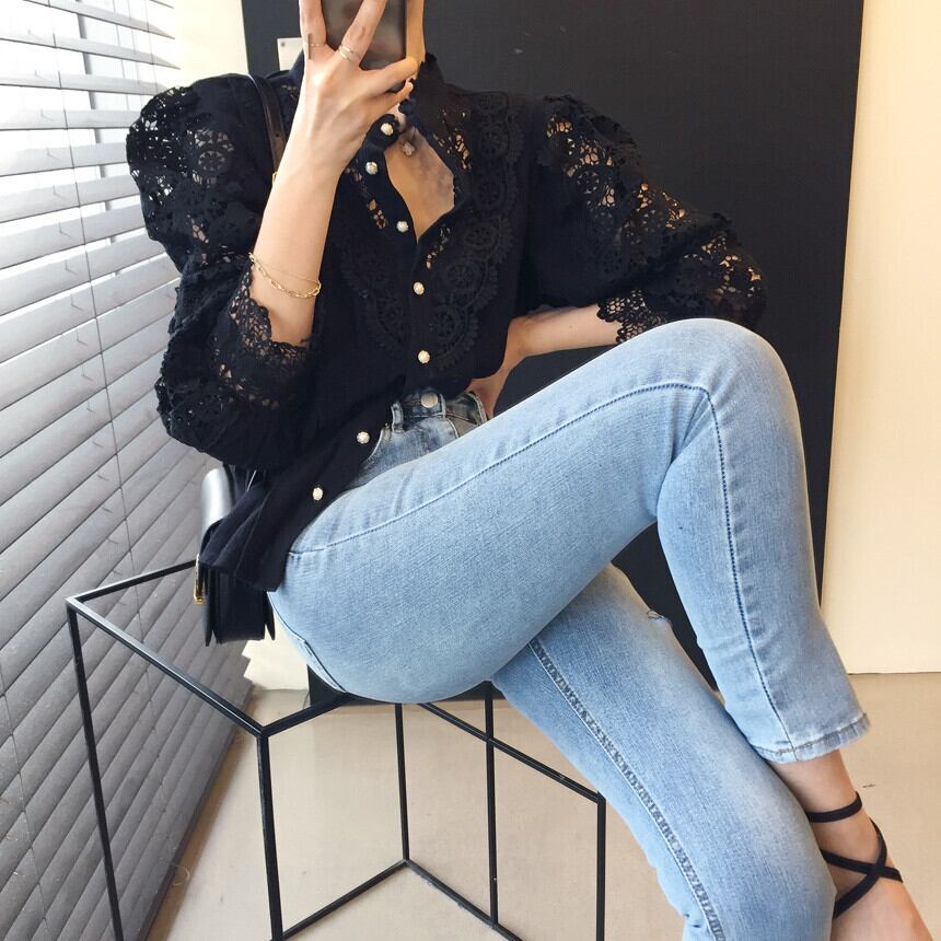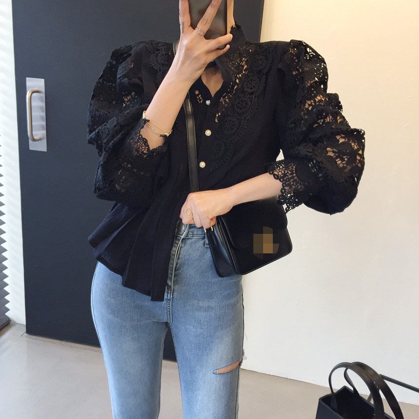 サマーパールボタンカラーレースシャツ トップス レディース ロング 夏物 真珠 韓国婦人32854735740