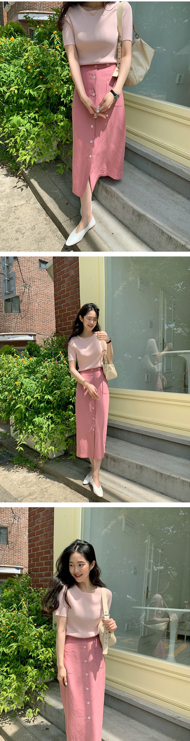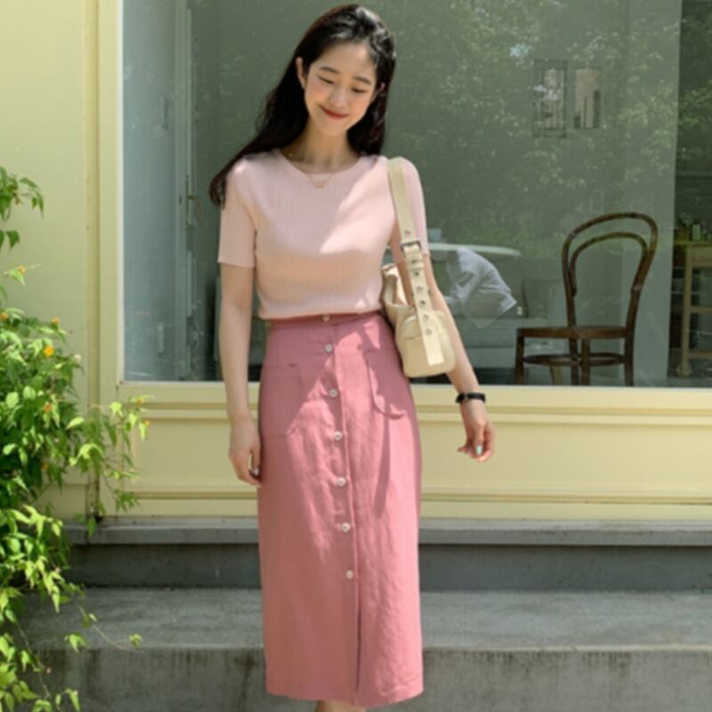 サマーニットトップス ハイウェストスカート ピンク 大人ガーリー スウィート キュート カジュアル 夏物 韓国婦人85876581658