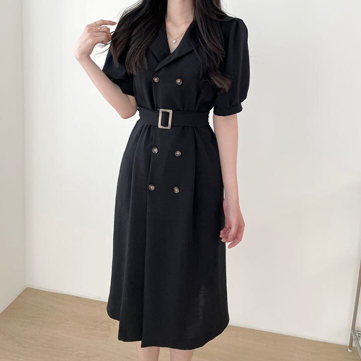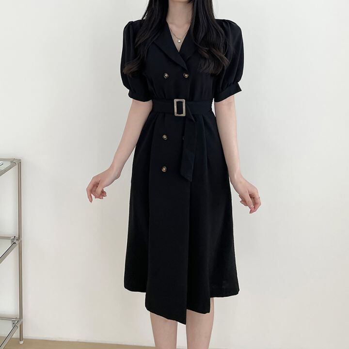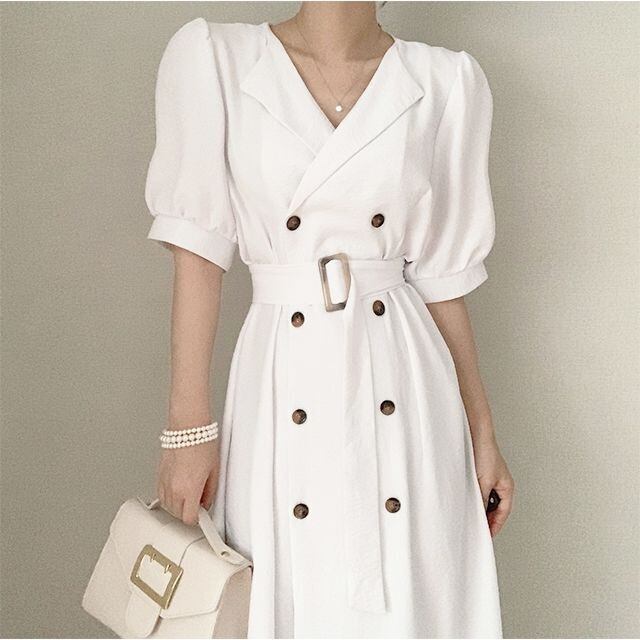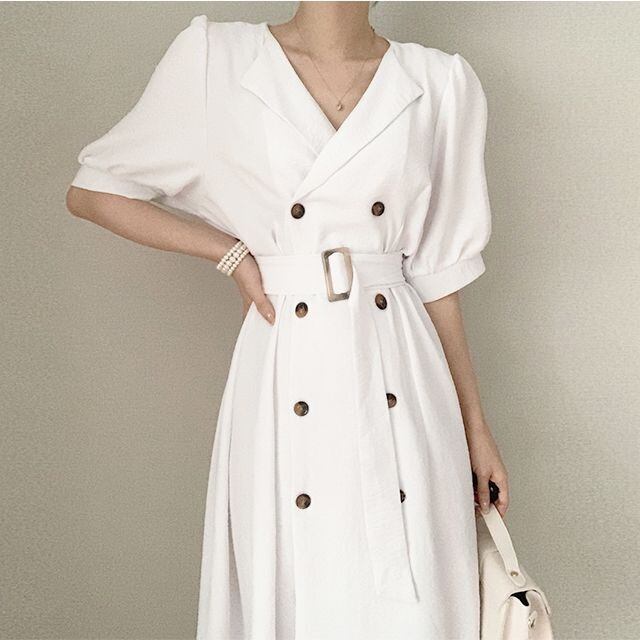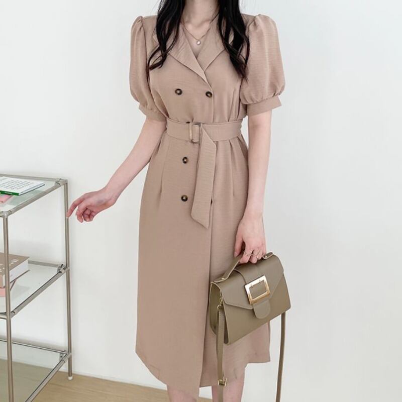 ダブルブレストウェスト薄手スリーブドレス サマースタイルロングスカート 夏物 韓国婦人67652432011