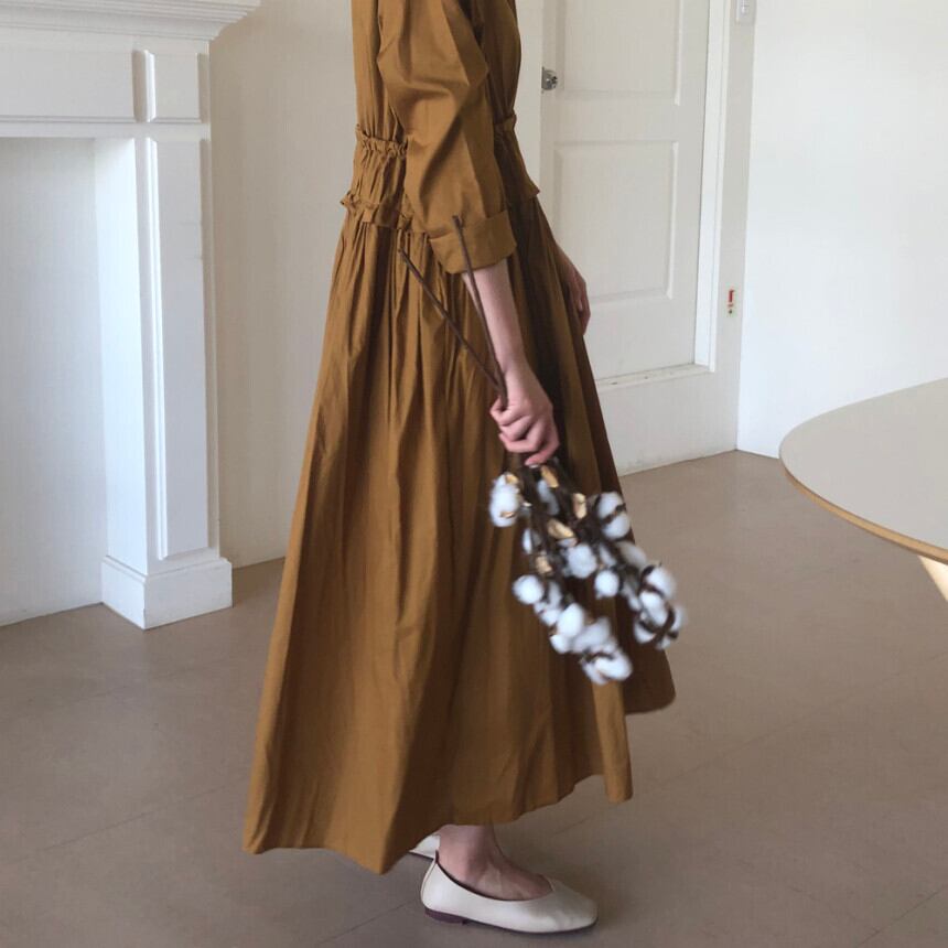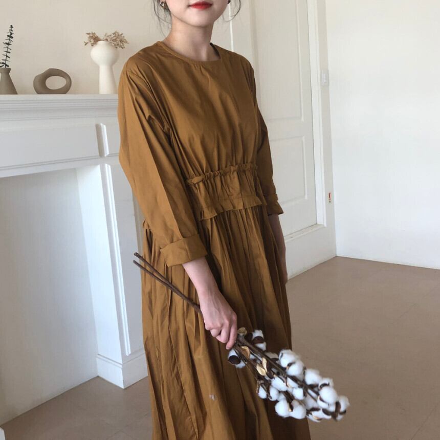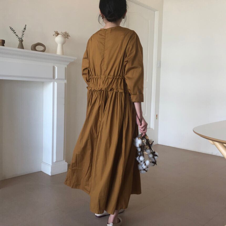 スプリングミニマリストスタンダードラウンドネックプリーツギャザールーズドレス レトロ 春物 Oネック ステッチ 韓国婦人10938309074
