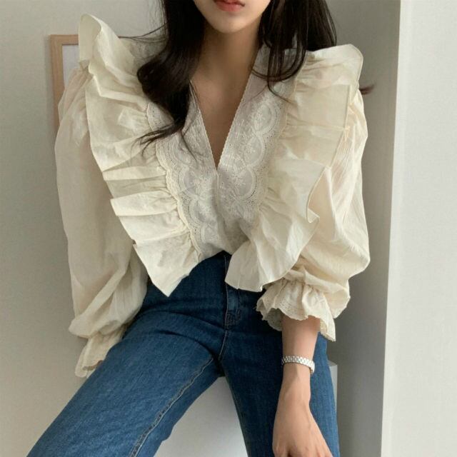 スプリングスタイルスリムレース長袖スリーブシャツ トップス ロング 春物 韓国婦人53842946799