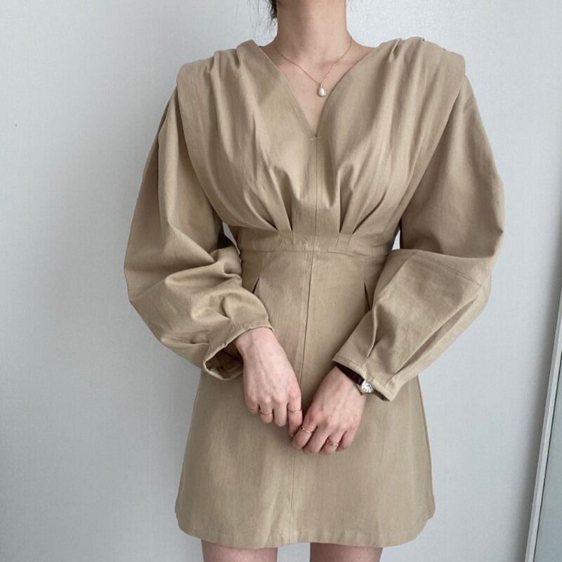 スプリング薄手ドレス 長袖スリーブVネックショートスカート ロング 春物 韓国婦人72063391664