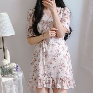 スタイルシフォンフローラルVネックウェストドレス スカート レディース レース 花柄 レースアップ 韓国婦人35158879074