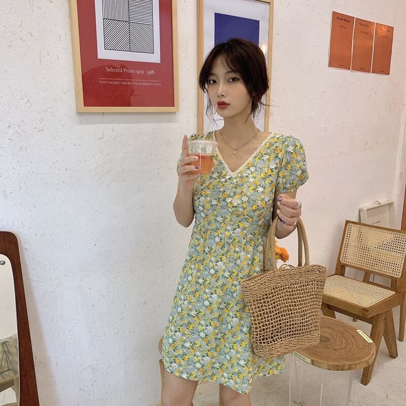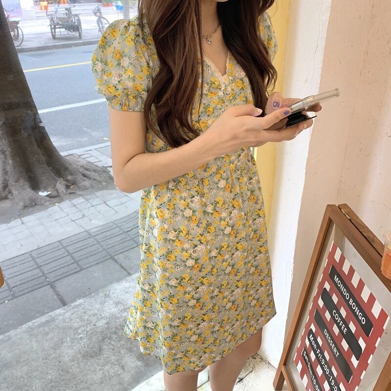 スカート スタイルサマーフローラルレースVネック薄手Aラインドレス レディース 夏物 花柄 ステッチ 韓国婦人31930704077
