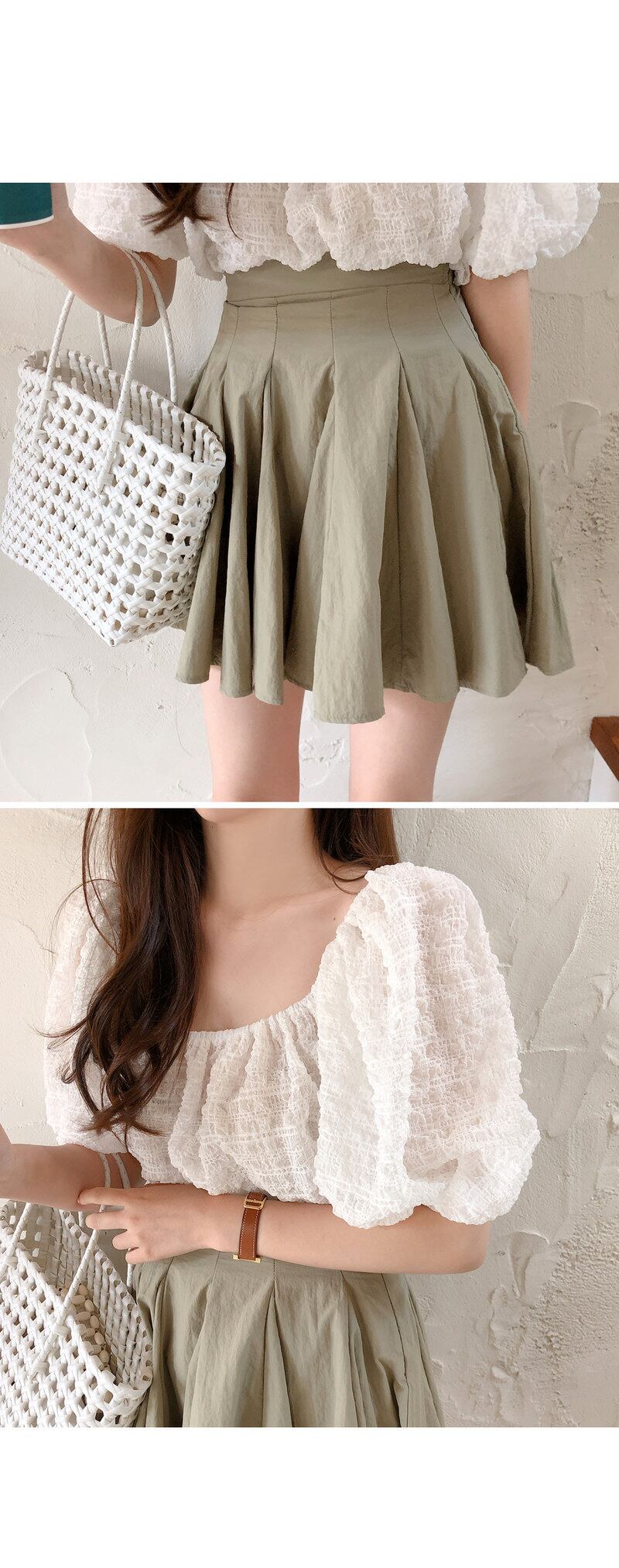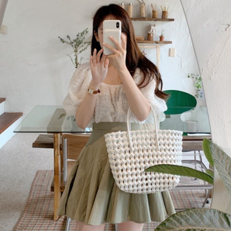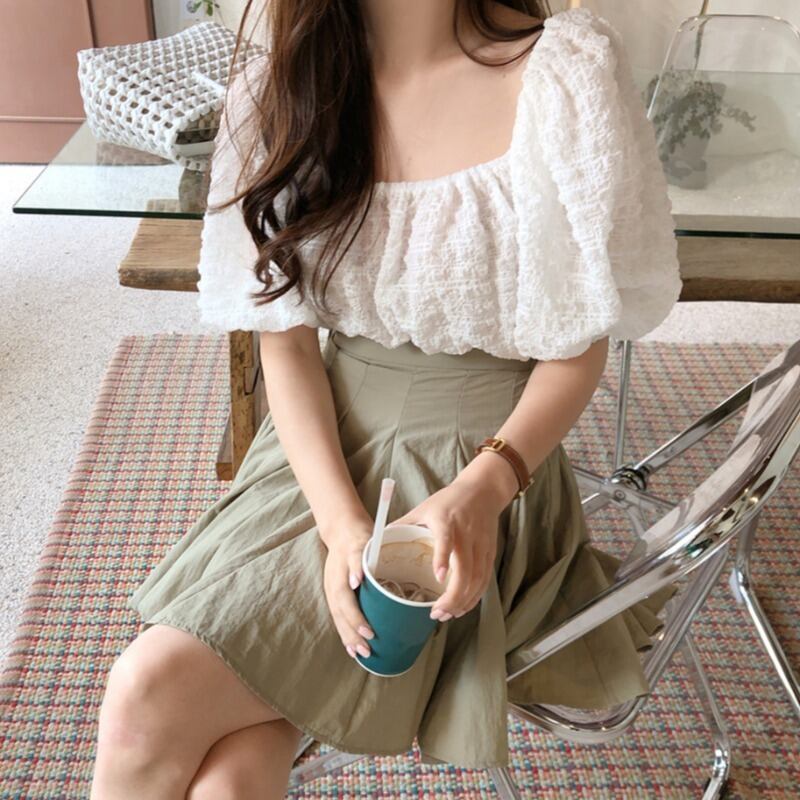サマーカラースリーブシャツ ハイウェストウェスト薄手プリーツスカート 夏物 スクウェア 韓国婦人83206267028