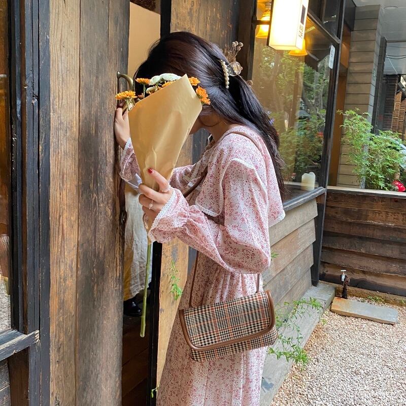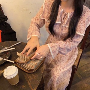 スプリング薄手ネイビーフローラルシフォンドレス ロング 春物 花柄 韓国婦人57226528530