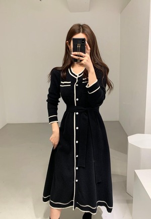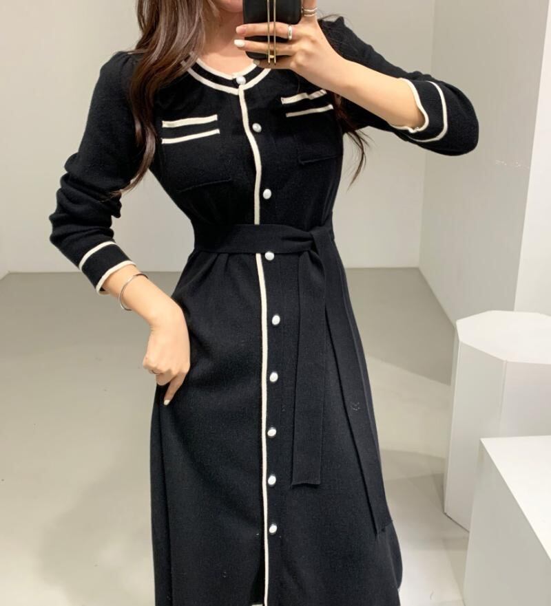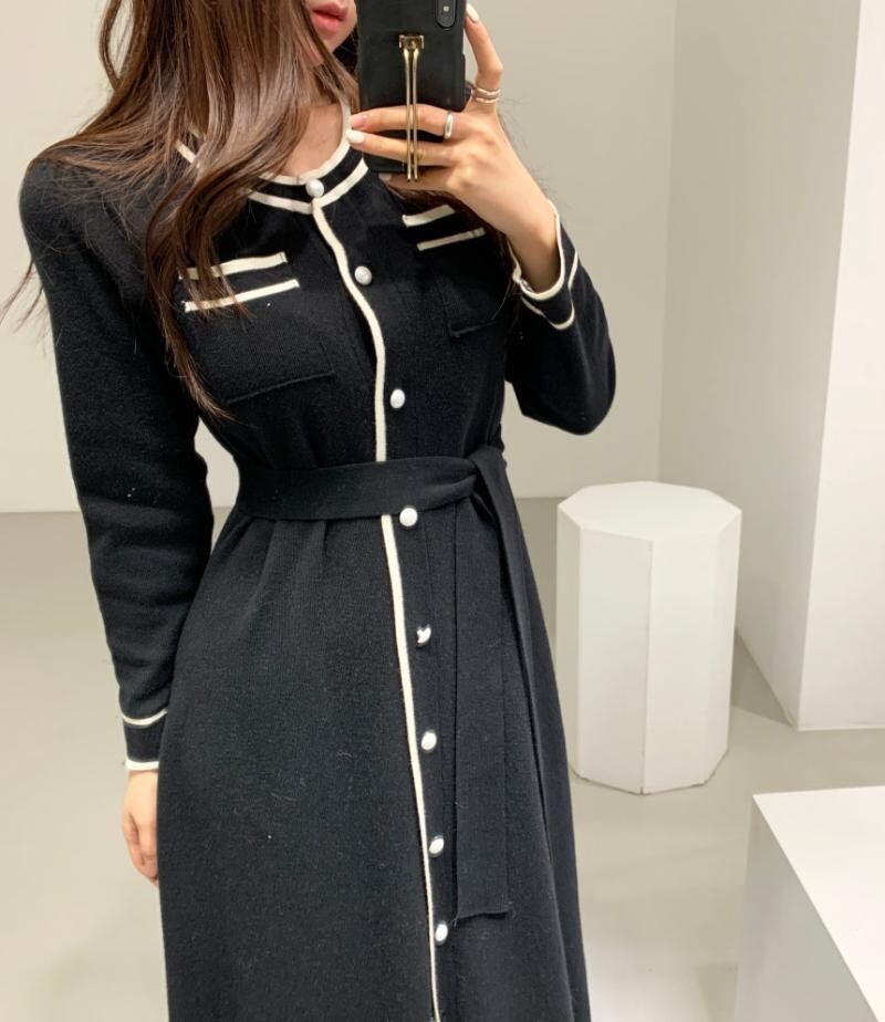 カラーラインウェストニットドレス ロングスカート サマー 夏物 韓国婦人23438307908