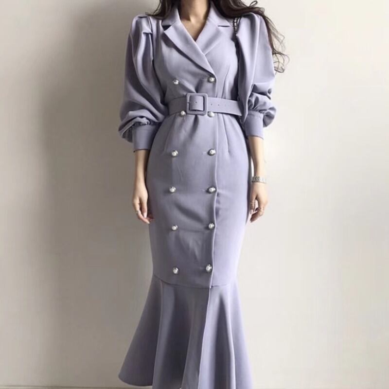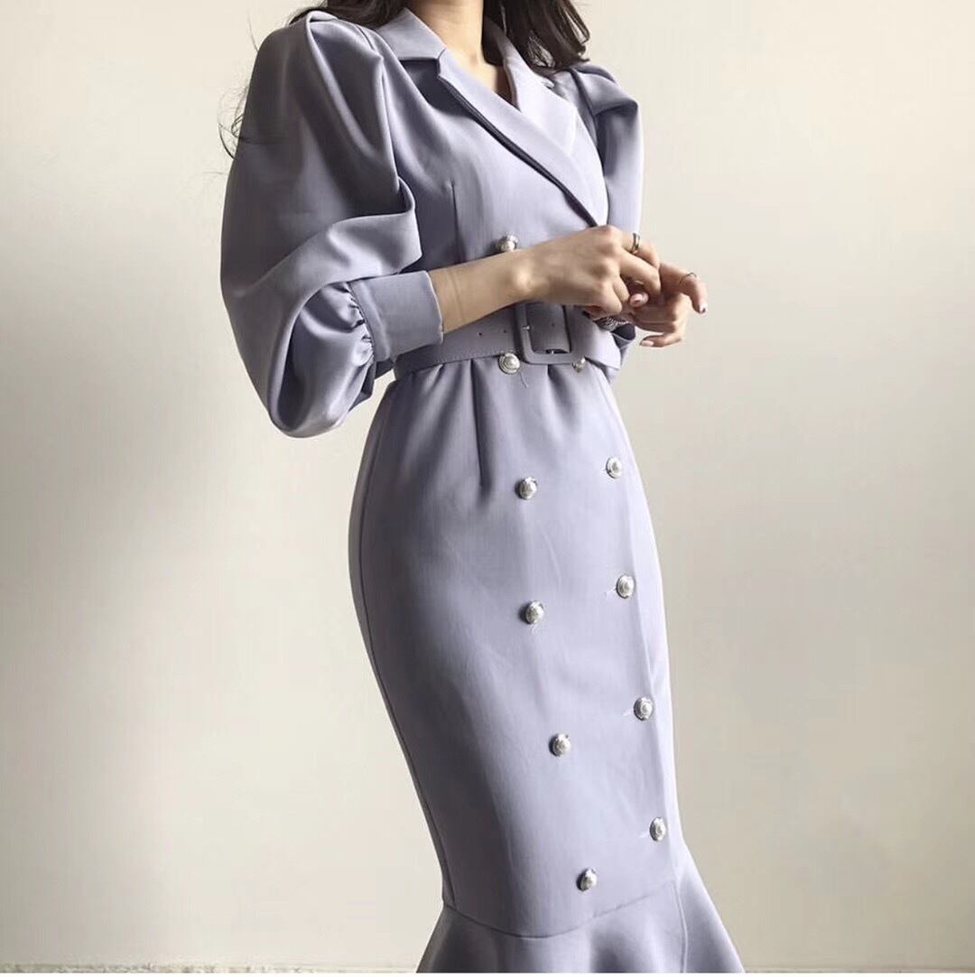 スプリングスタンダードスリーブカラーダブルブレストスリムフィットドレス レトロ 春物 韓国婦人91101412045