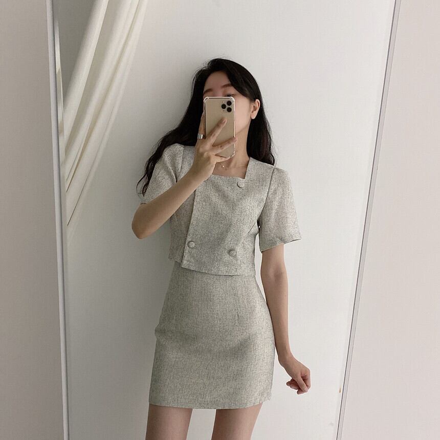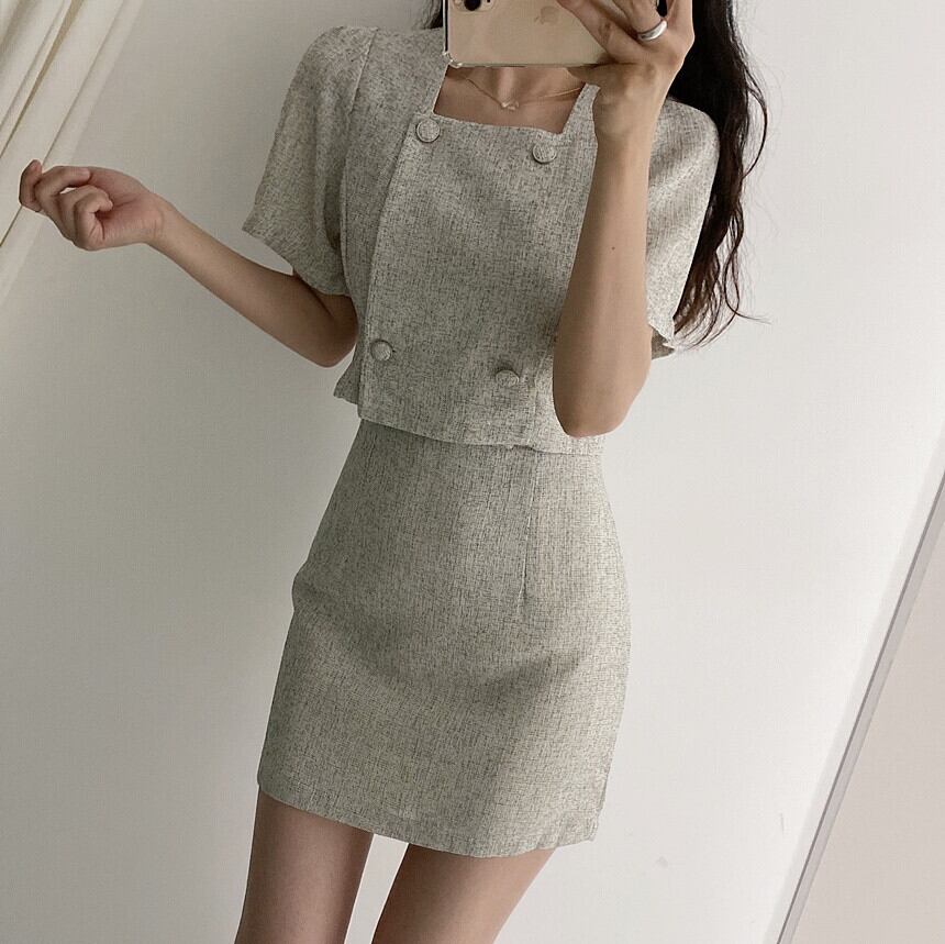 スタイルダブルブレストカラーAラインスカート スタンダード レトロ スクウェア 韓国婦人4094048140