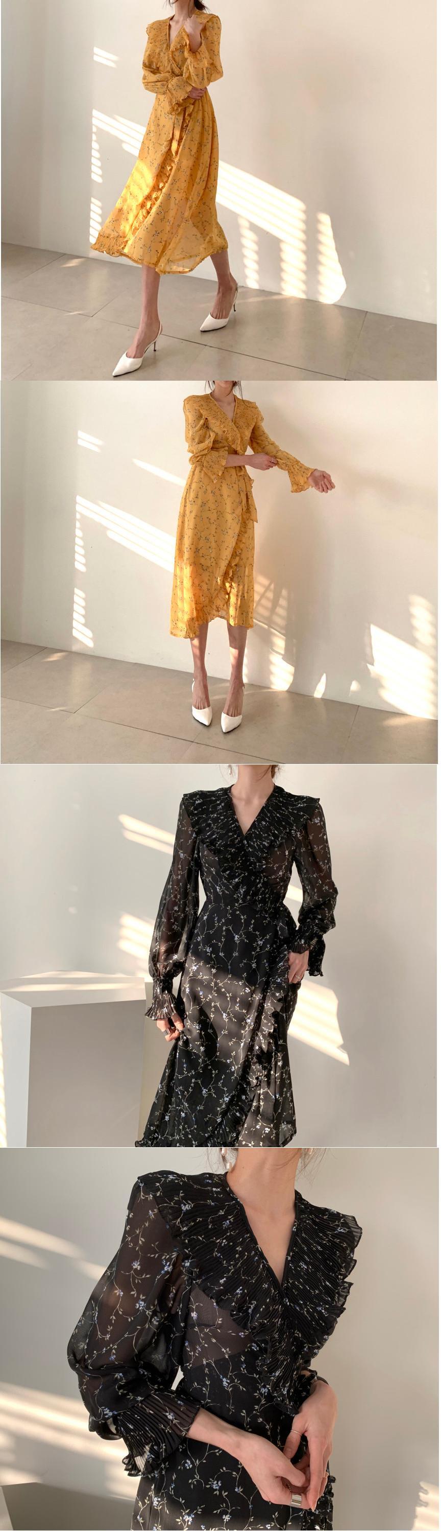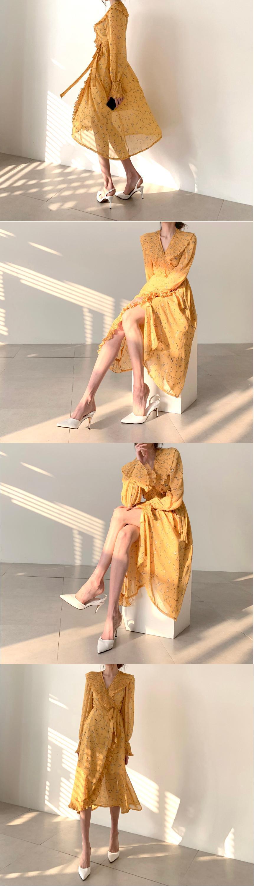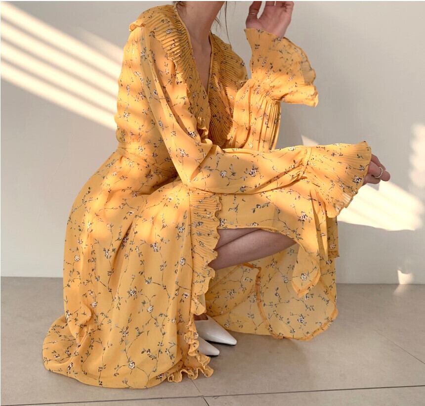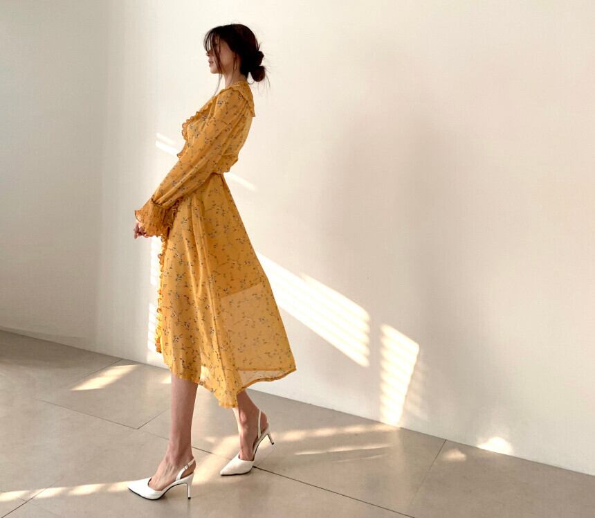 スプリングフローラルVネックウェスト薄手ドレス ロング 春物 花柄 韓国婦人33821883179