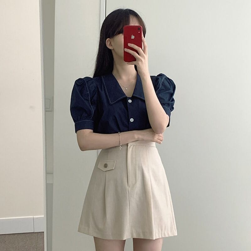 サマースリーブシャツ ポケットハイウェストウェストスカート 大人ガーリー スウィート キュート カジュアル 夏物 韓国婦人5715423452