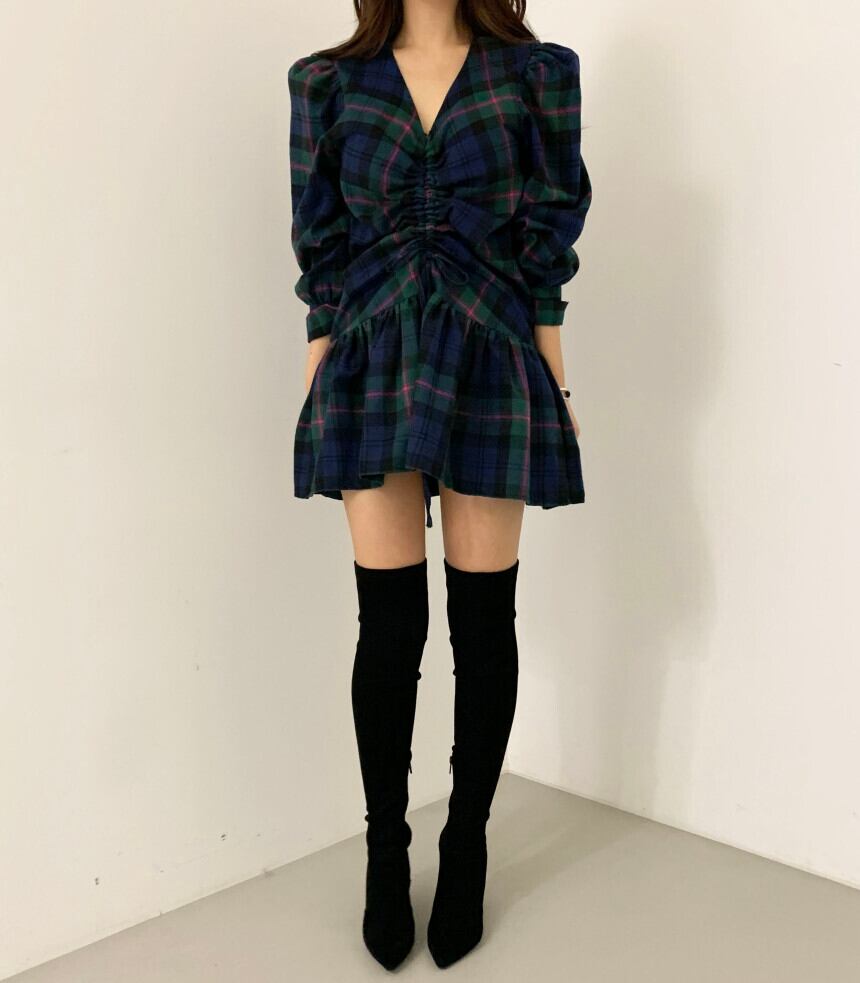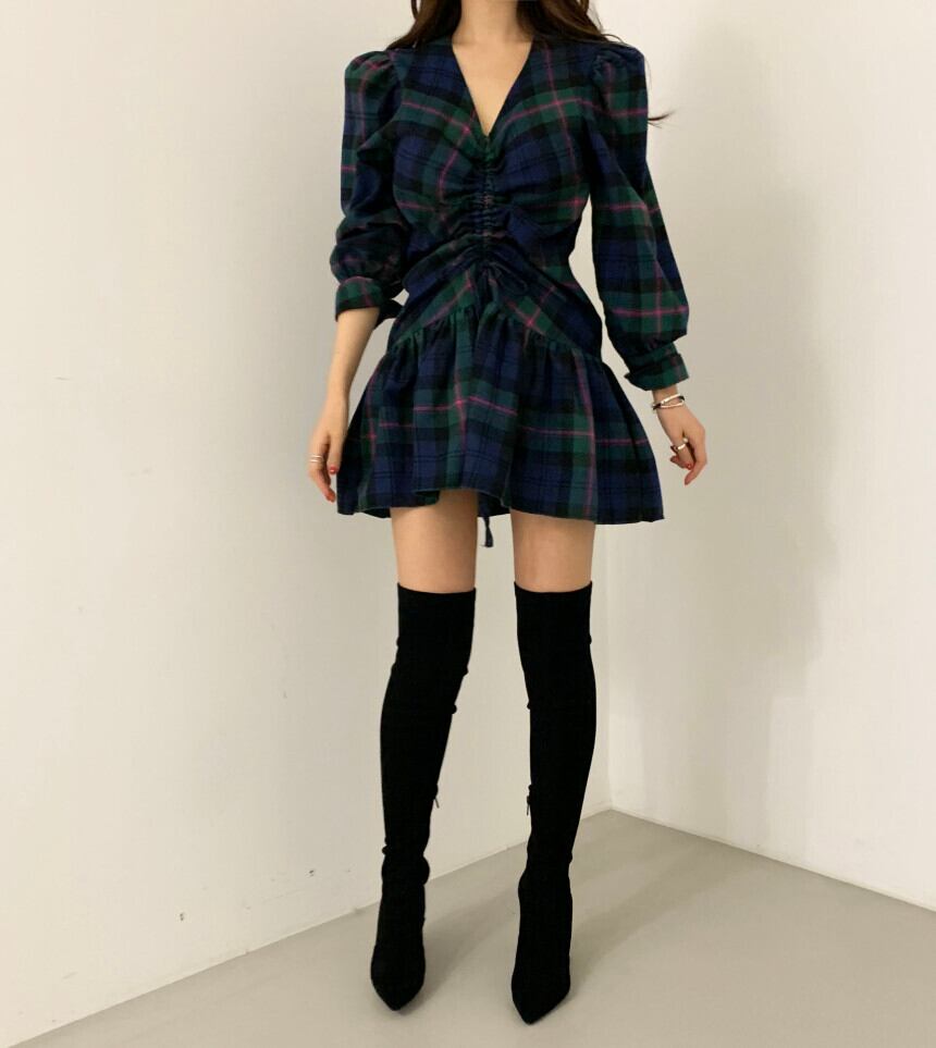 スプリングカラーVネック格子柄シャツ スカート ギャザースリーブドレス 春物 韓国婦人55746491536