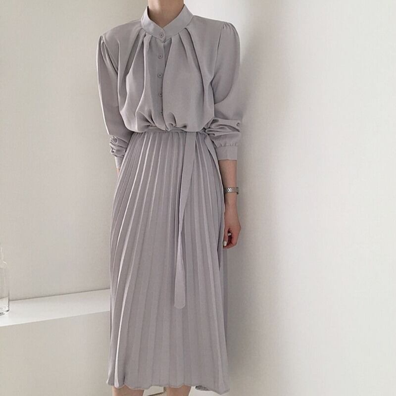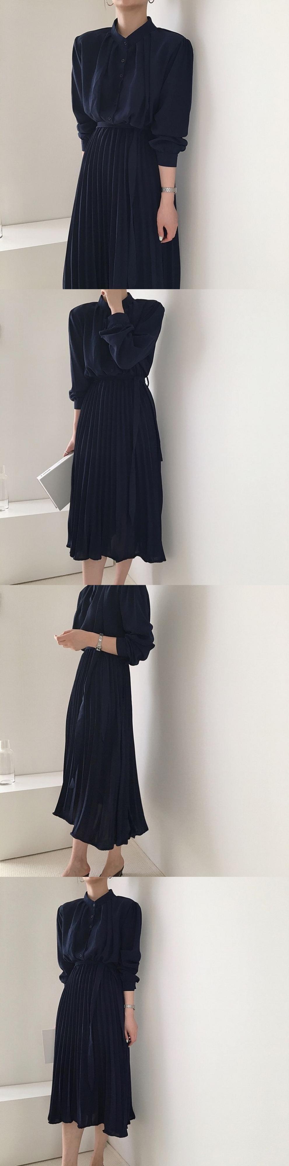 スカート ウェストカラーロングドレス プリーツ 韓国婦人36829579789