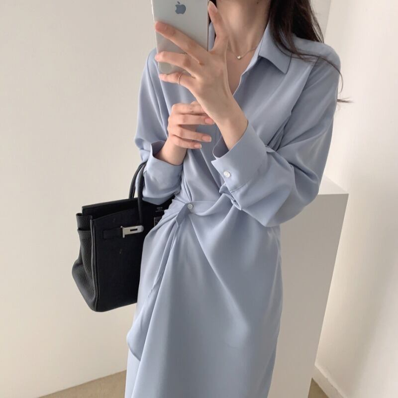 スタイルロングシャツ ドレス ウェストスリム薄手スカート 大人ガーリー スウィート キュート カジュアル 韓国婦人42518953786