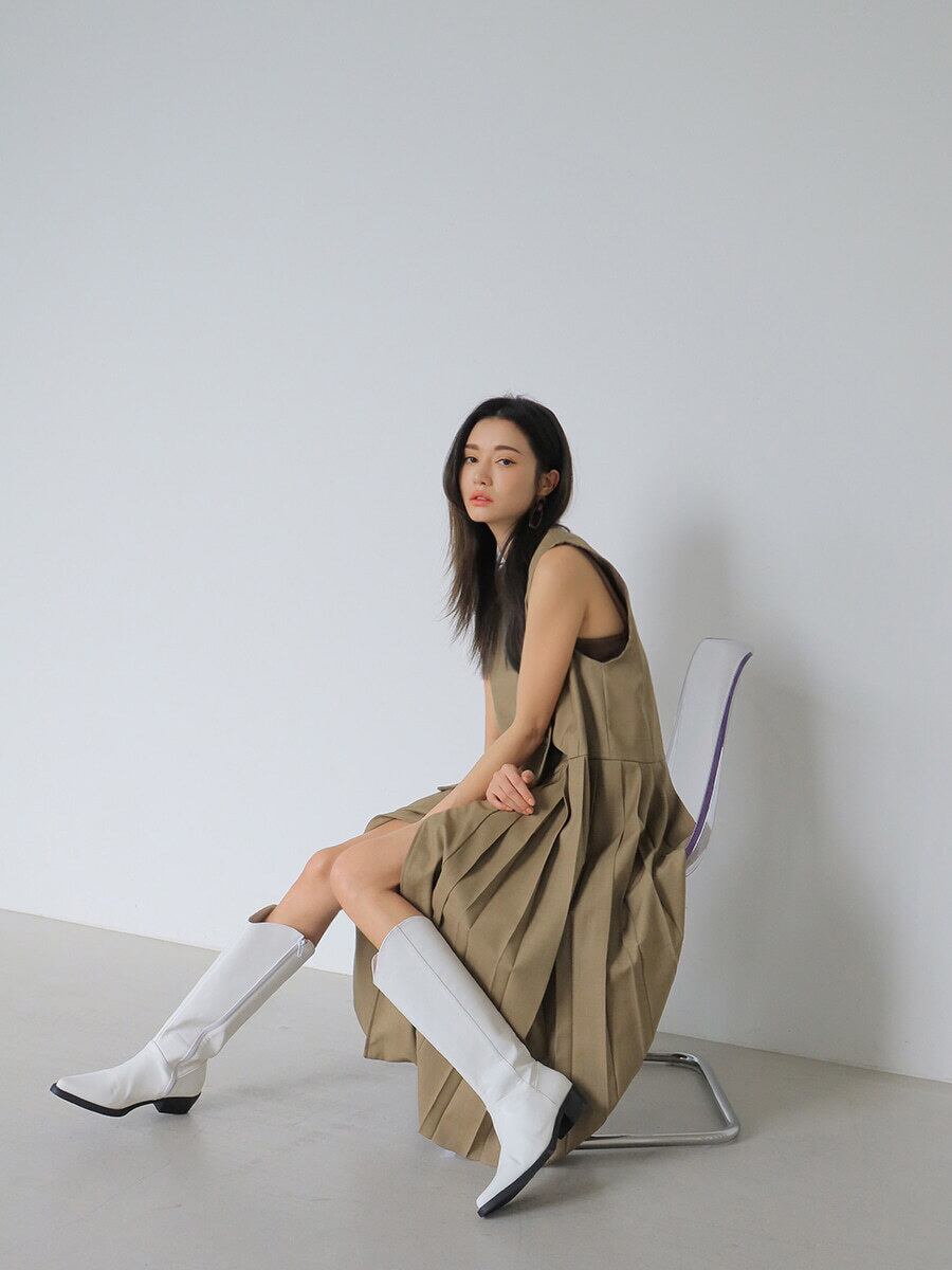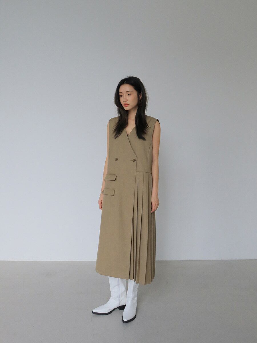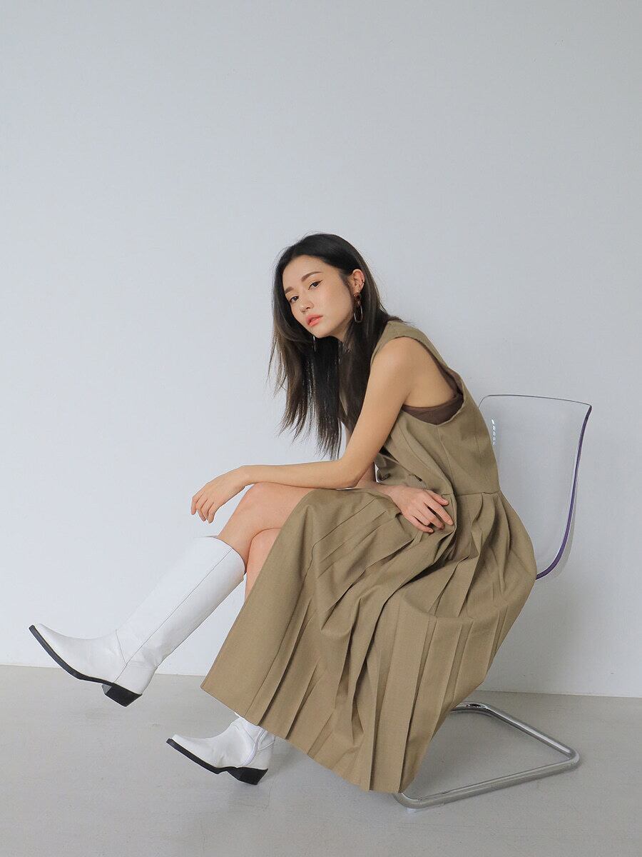 Vネッククロスルーズサイドプリーツノースリーブドレス ロングスカート 韓国婦人19370964401