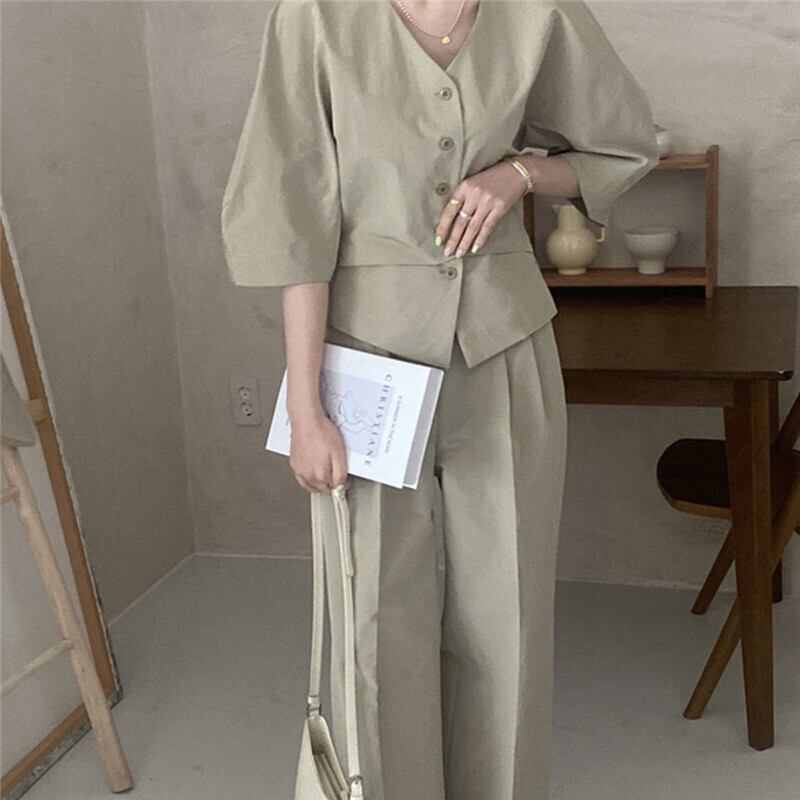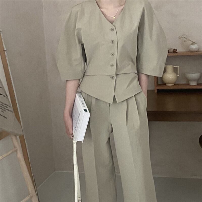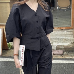 サマースタンダードVネックスリーブシャツ カジュアルレディースベルト レトロ 夏物 ハーネス 韓国婦人5425505823