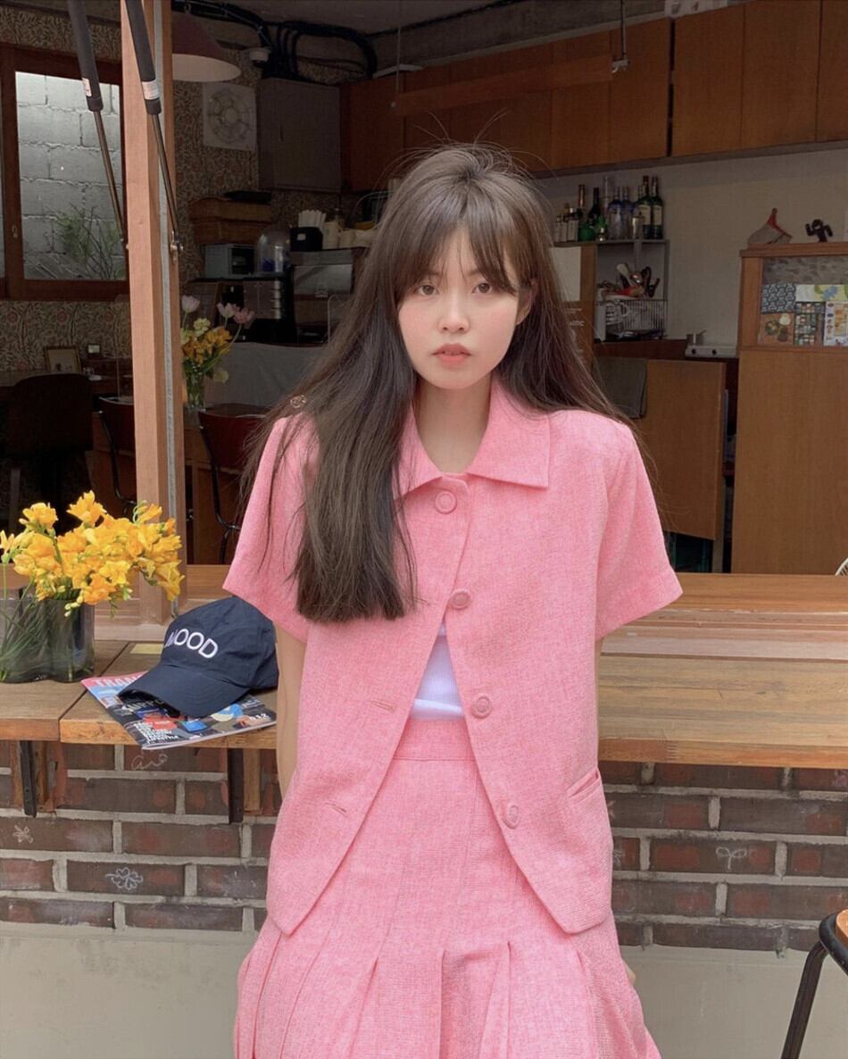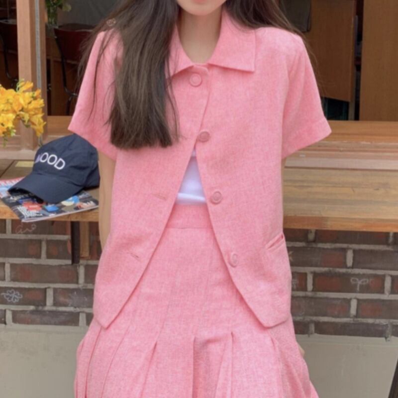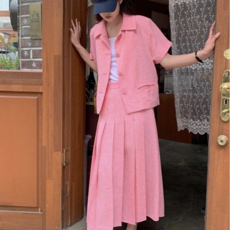 ジャケット プリーツハイウェストウェストスカート カジュアルサマー ピンク 夏物 韓国婦人4110170005