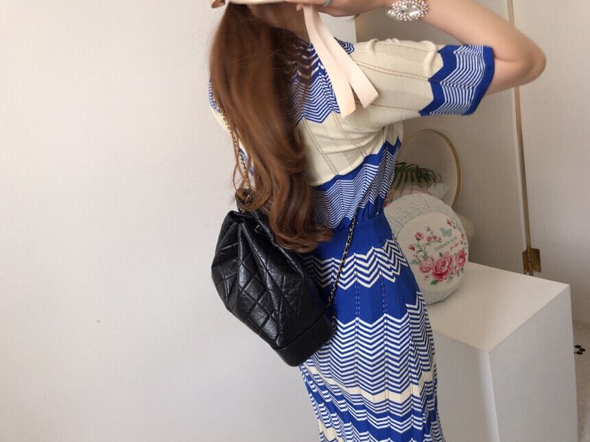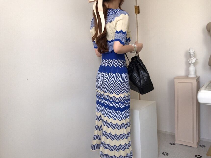 サマースタンダードカラーパターンVネックニットトップス スカート レディース レトロ 夏物 韓国婦人28282517863